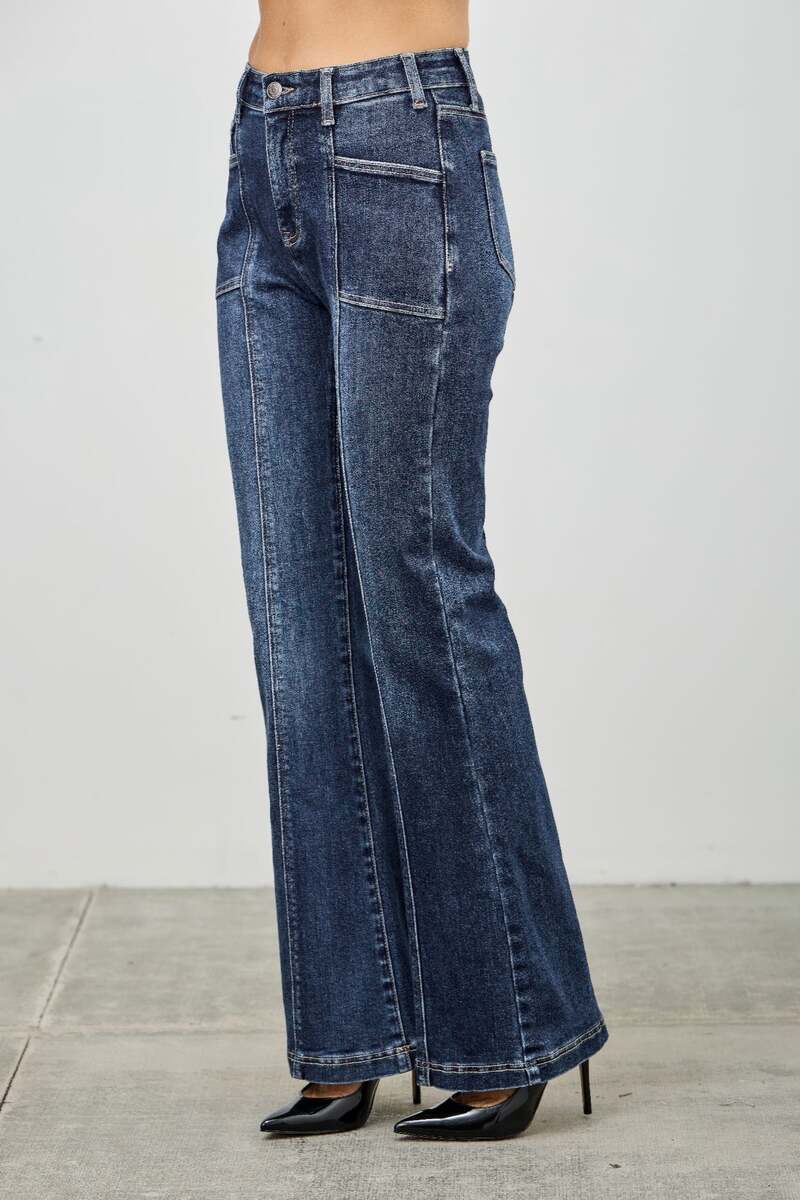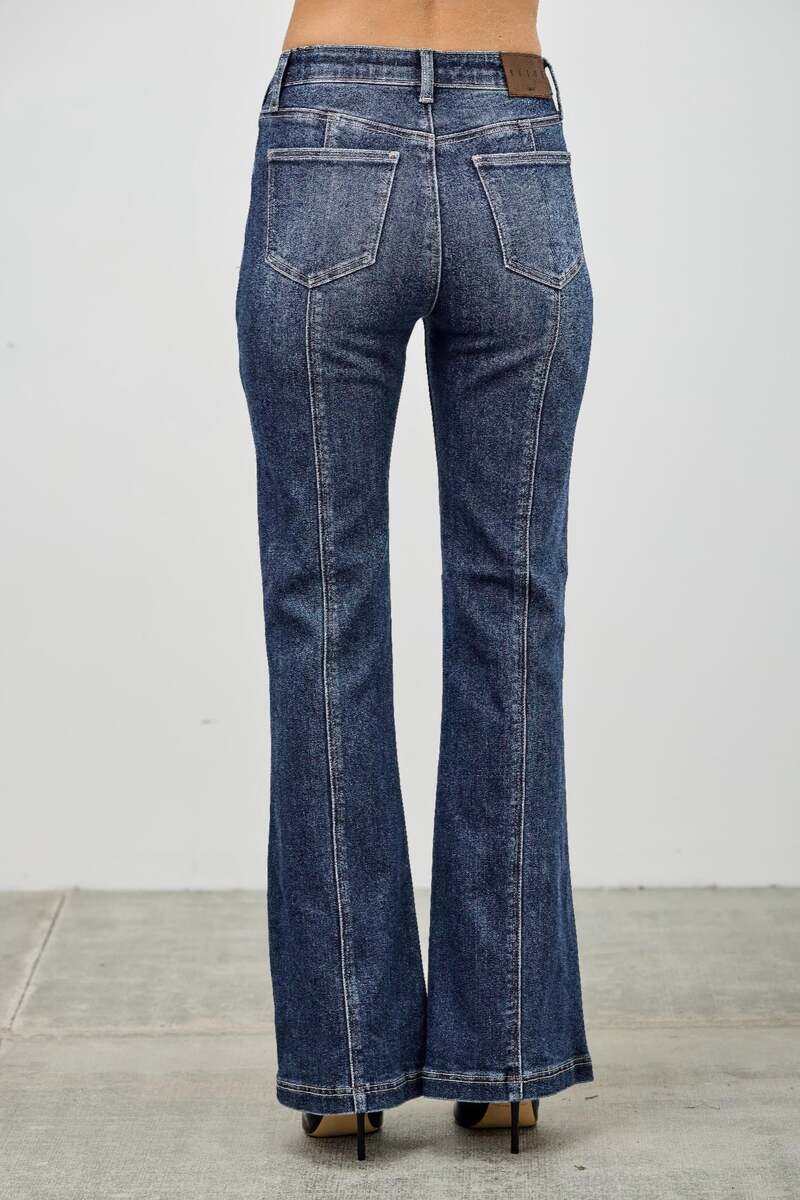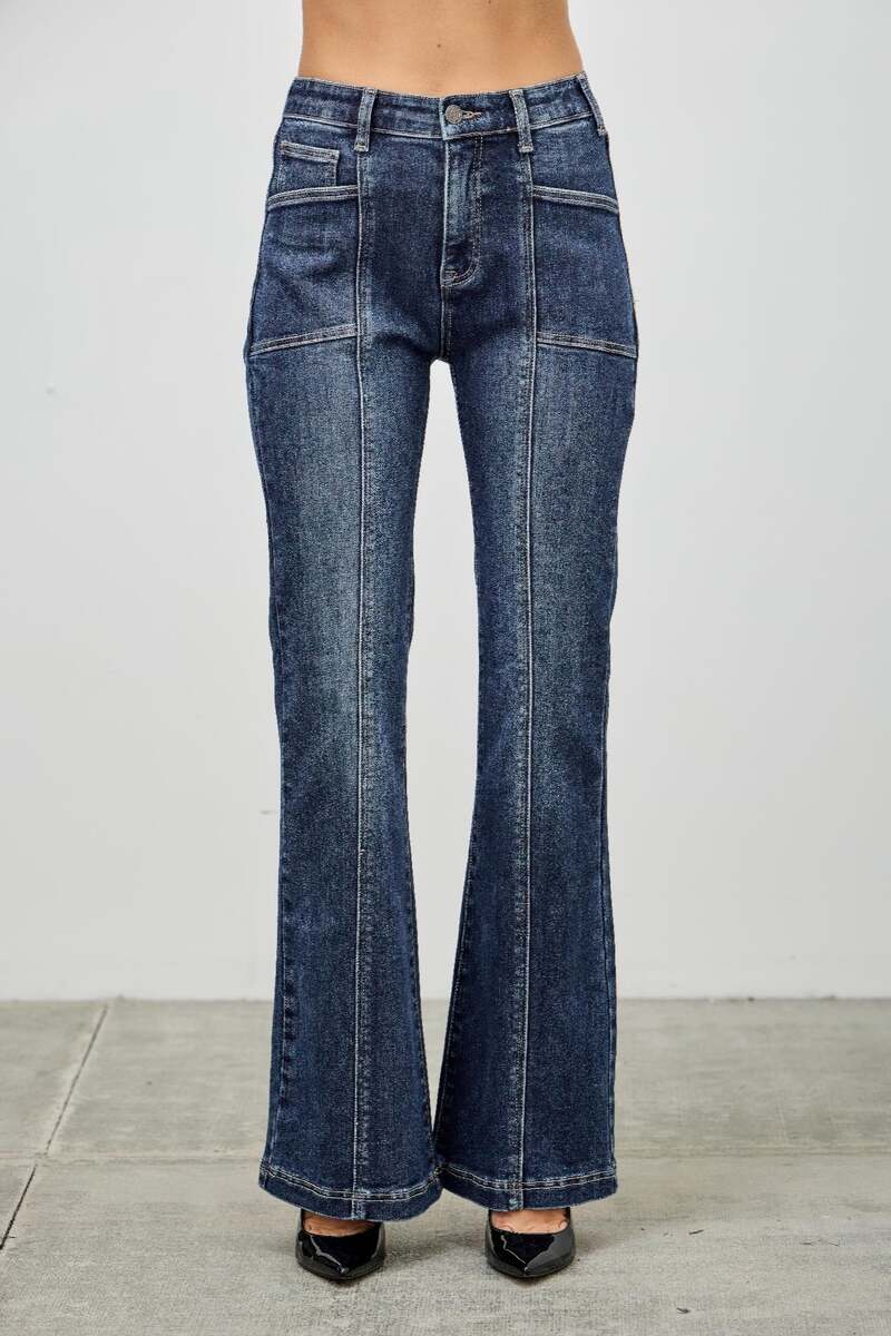 These high rise boot cut jeans with seam detail offer a modern twist on a timeless silhouette. Crafted from a soft, stretch denim blend, they provide a flattering fit through the hips and thighs before gently flaring out at the hem. The high-rise waist enhances your shape, while the subtle seam detailing adds a tailored, elongating effect. Finished with classic five-pocket styling and a zip fly, this pair brings polish and comfort to your everyday denim collection.