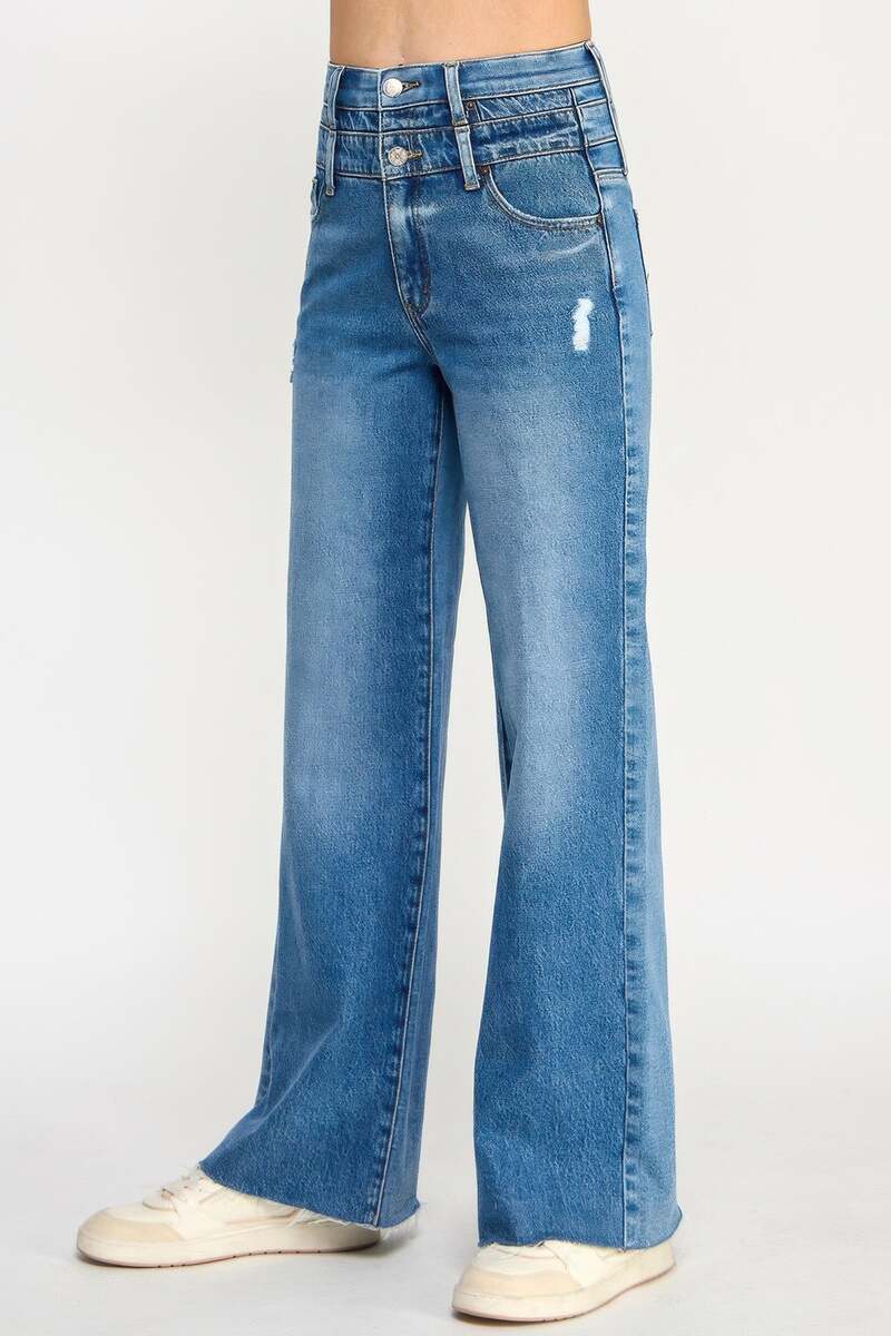 Step up your denim game with these high rise double waist wide leg jeans, a bold fusion of structure and statement. Designed with a unique double waistband, this pair adds an unexpected layered look while enhancing the waistline for a flattering fit. The wide leg cut delivers a modern, elongating silhouette, and the stretch-infused fabric ensures all-day comfort. With classic five-pocket styling and a zip fly, these jeans offer the perfect balance of trend-forward design and everyday wearability.
