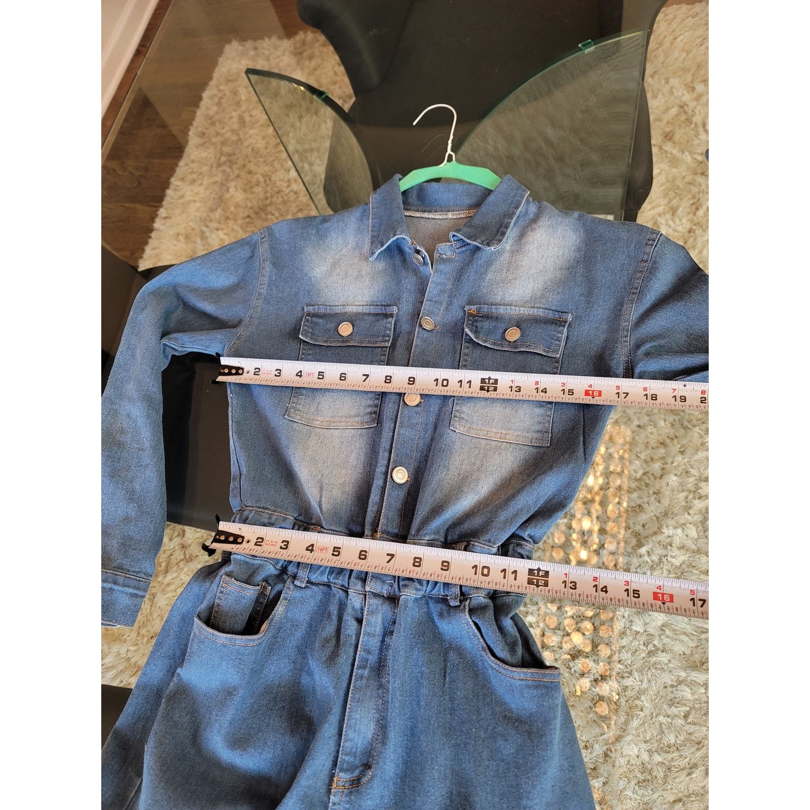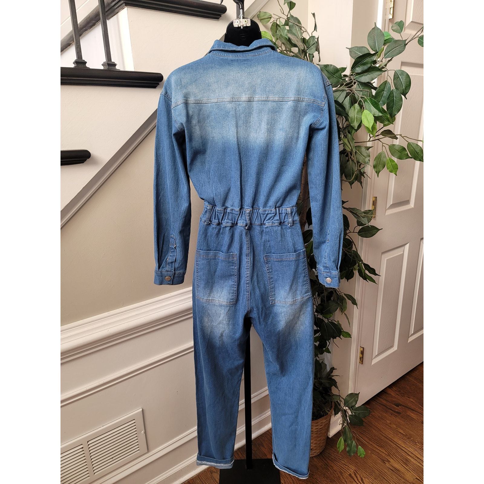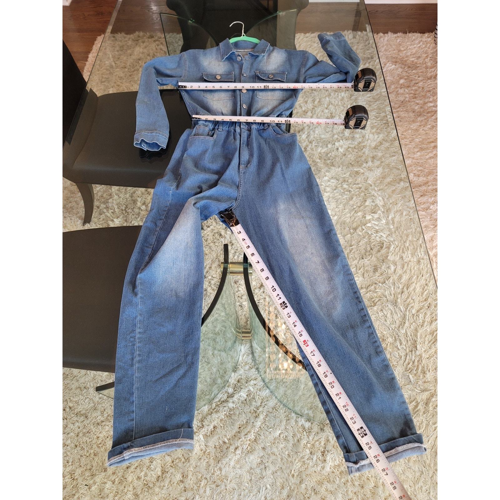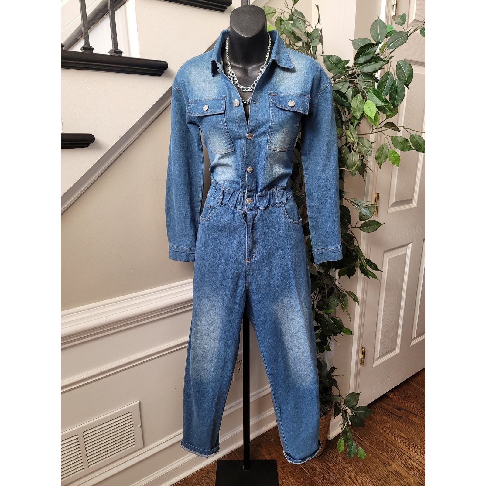 Women?s denim jumpsuit in size small is a stylish all-in-one outfit perfect for casual or chic occasions. Designed with long sleeves, a button-front closure, and chest pockets, it offers both utility and fashion. The elastic waistband adds comfort and shape, while the soft cotton polyester blend ensures breathable wear year-round.
