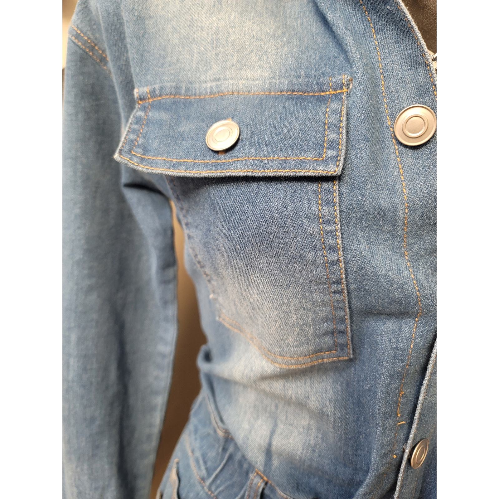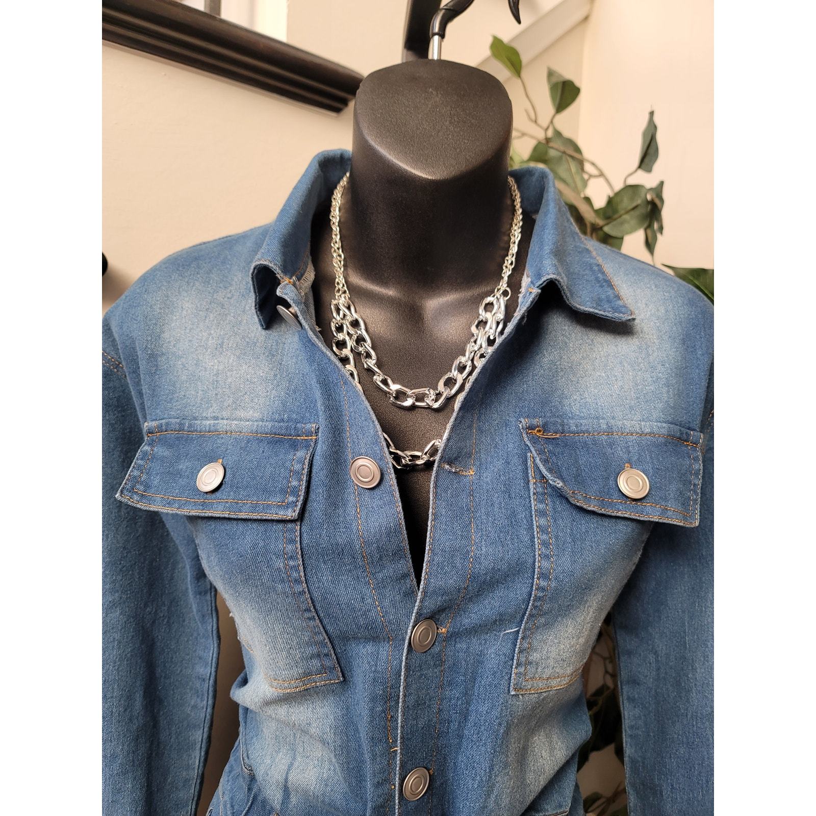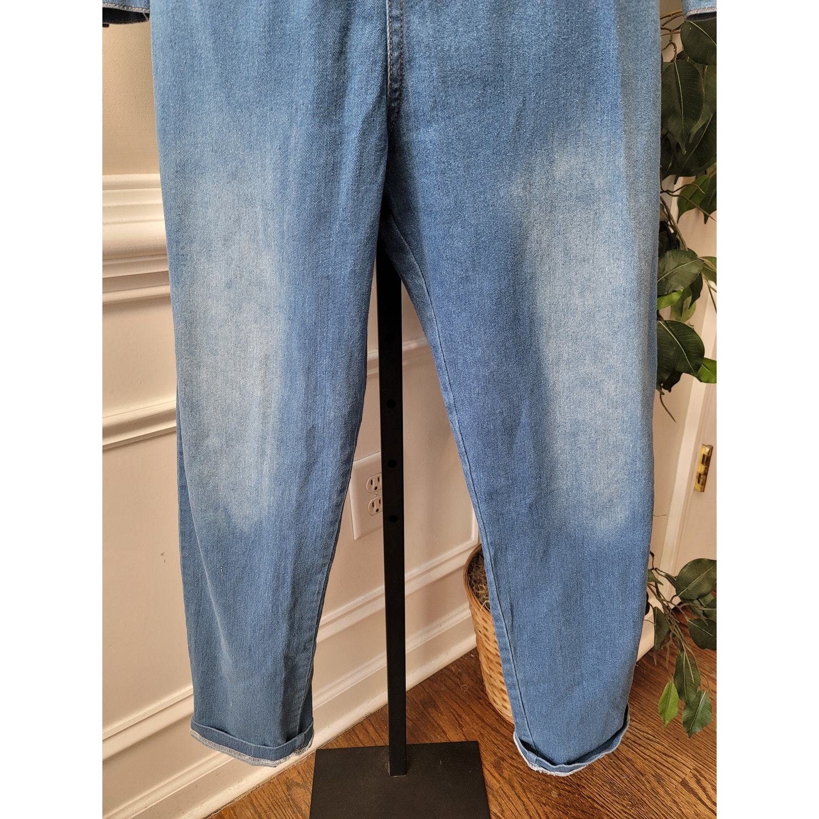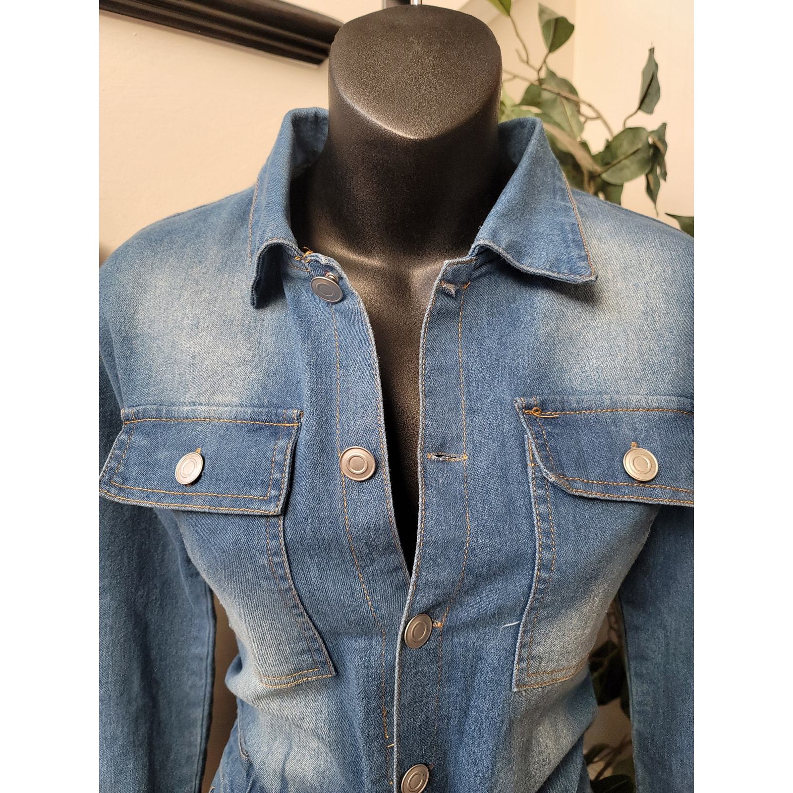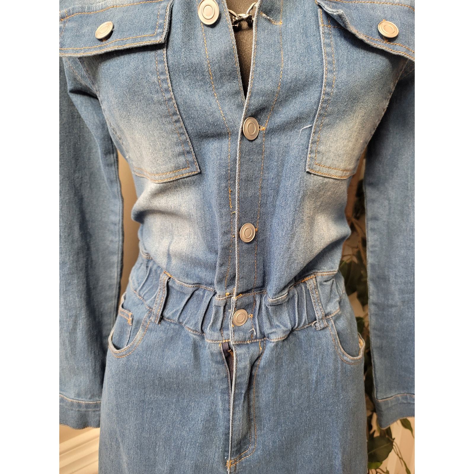 Women?s denim jumpsuit in size small is a stylish all-in-one outfit perfect for casual or chic occasions. Designed with long sleeves, a button-front closure, and chest pockets, it offers both utility and fashion. The elastic waistband adds comfort and shape, while the soft cotton polyester blend ensures breathable wear year-round.