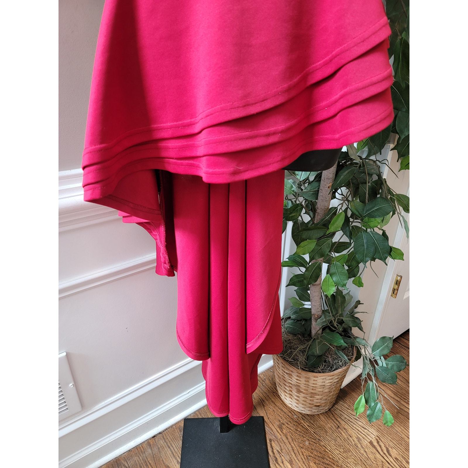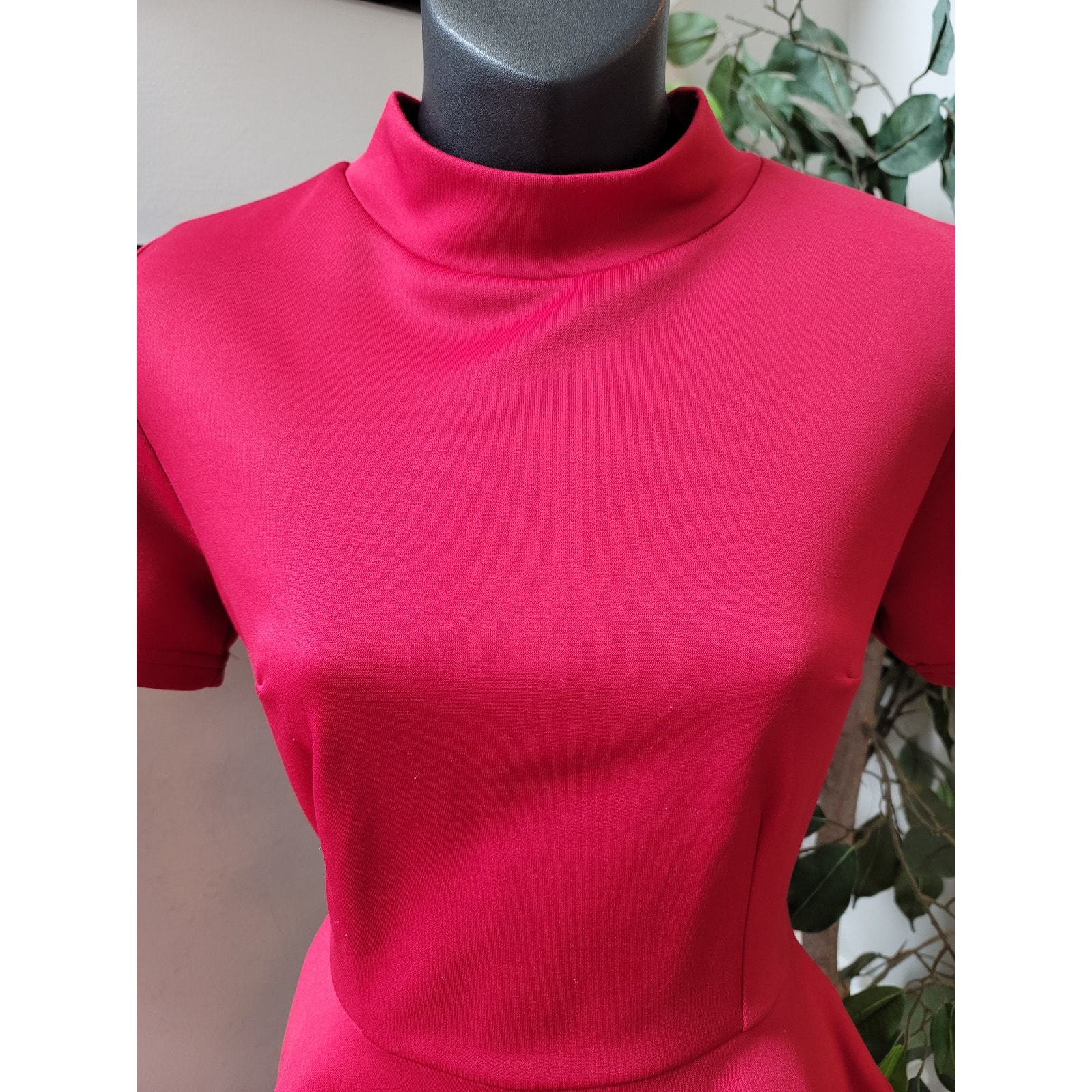 This women's red top is a stylish and flattering addition to any wardrobe. Featuring a short sleeve design and a mock neck, this top offers a chic and modern look. The asymmetrical hem and fit and flare silhouette create a unique and feminine shape, perfect for both casual and dressy occasions. The size is S. Don't miss out ? add this beautiful top to your collection today!