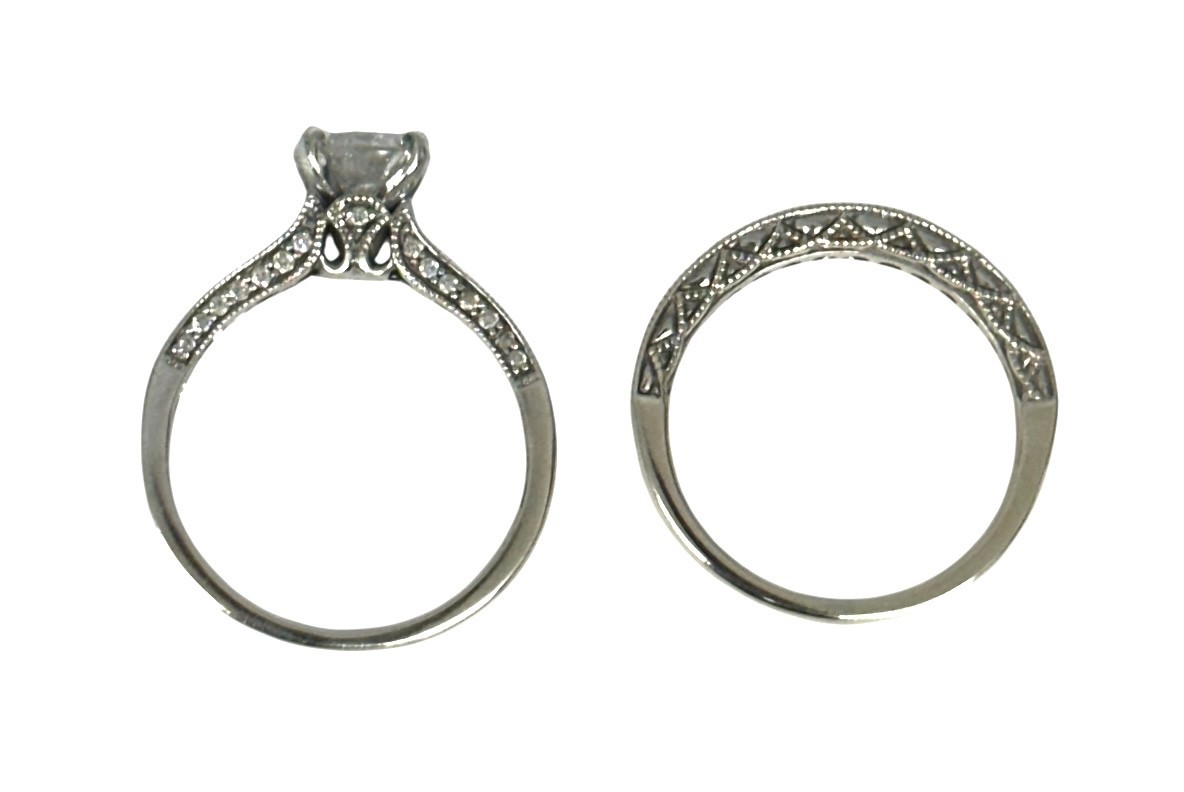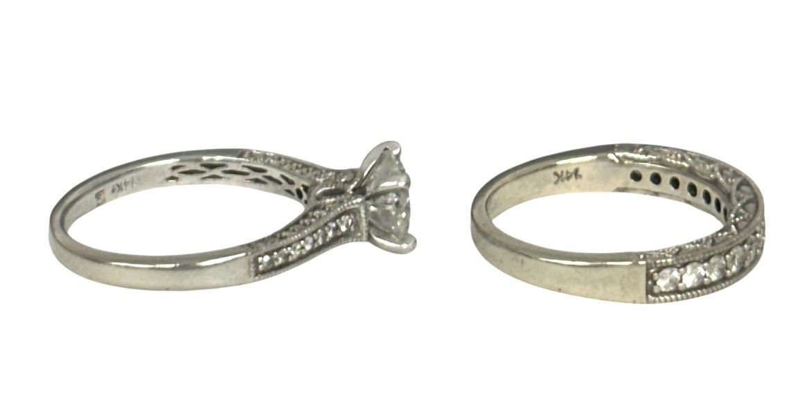 Type: Wedding setWeight: 5.0Karat: 14ktMetal: White GoldGender: Women'sStyle: Wedding setSize / Length: 7.5Owner applied: 14k Jx LLJStone 1 quantity: 1Stone 1 shape: RoundStone 1 color: ClearStone 1 weight (total): 1.30Stone 1 type: DiamondStone 2 Quantity: 57Stone 2 Shape: RoundStone 2 Color: ClearStone 2 Weight (Total): .80Stone 2 Type: DiamondCondition:UsedNotes:Missing 1 small stone that is barely noticeable.