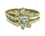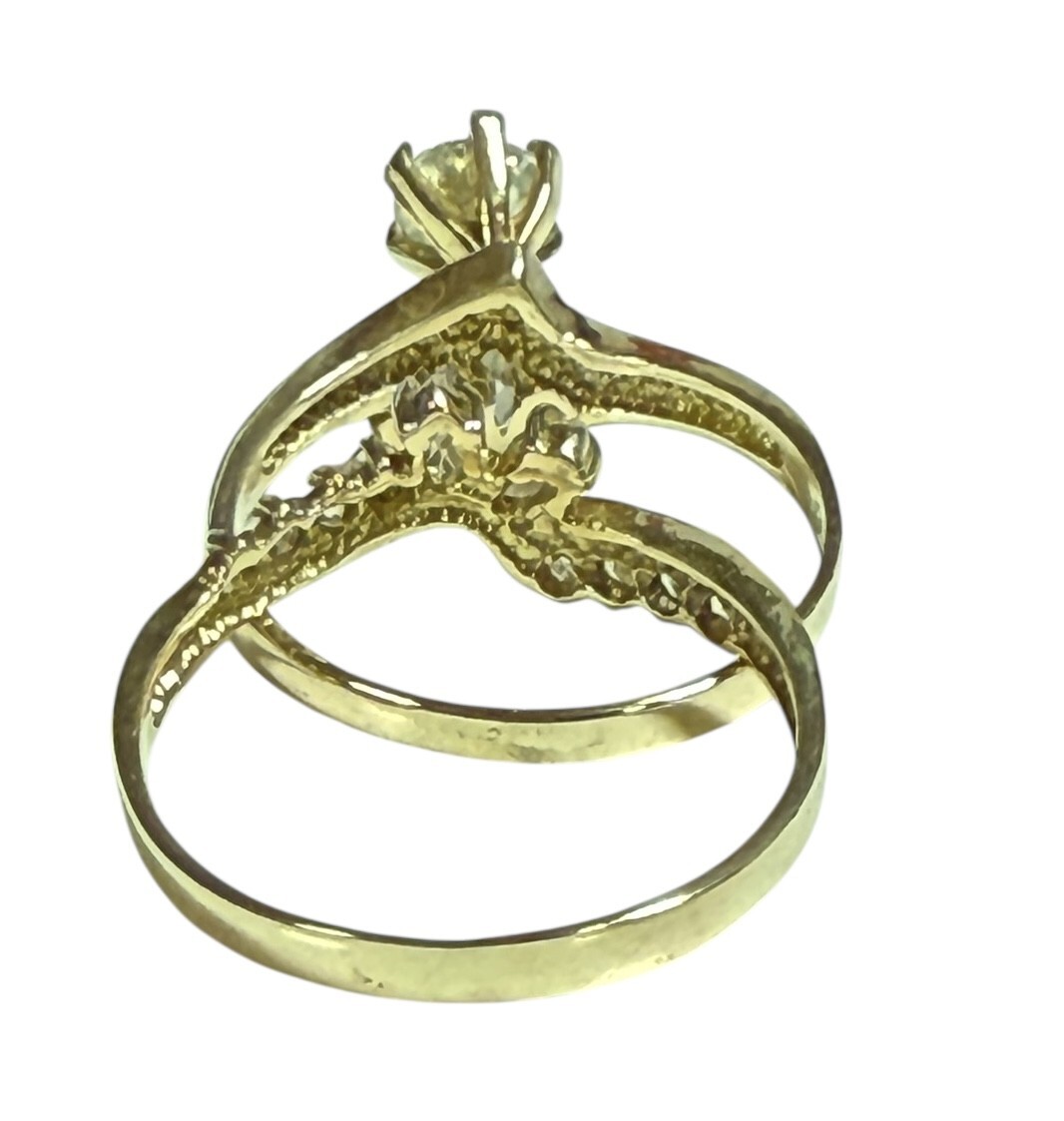 Type: Wedding setWeight: 3.8Karat: 14ktMetal: Yellow GoldGender: Women'sStyle: ClusterSize / Length: 10.25Owner applied: 14ktStone 1 quantity: 1Stone 1 shape: RoundStone 1 color: ClearStone 1 weight (total): 1.0Stone 1 type: Cubic ZirconiaStone 2 Quantity: 12Stone 2 Shape: OtherStone 2 Color: ClearStone 2 Weight (Total): .50Stone 2 Type: Cubic ZirconiaCondition:Used