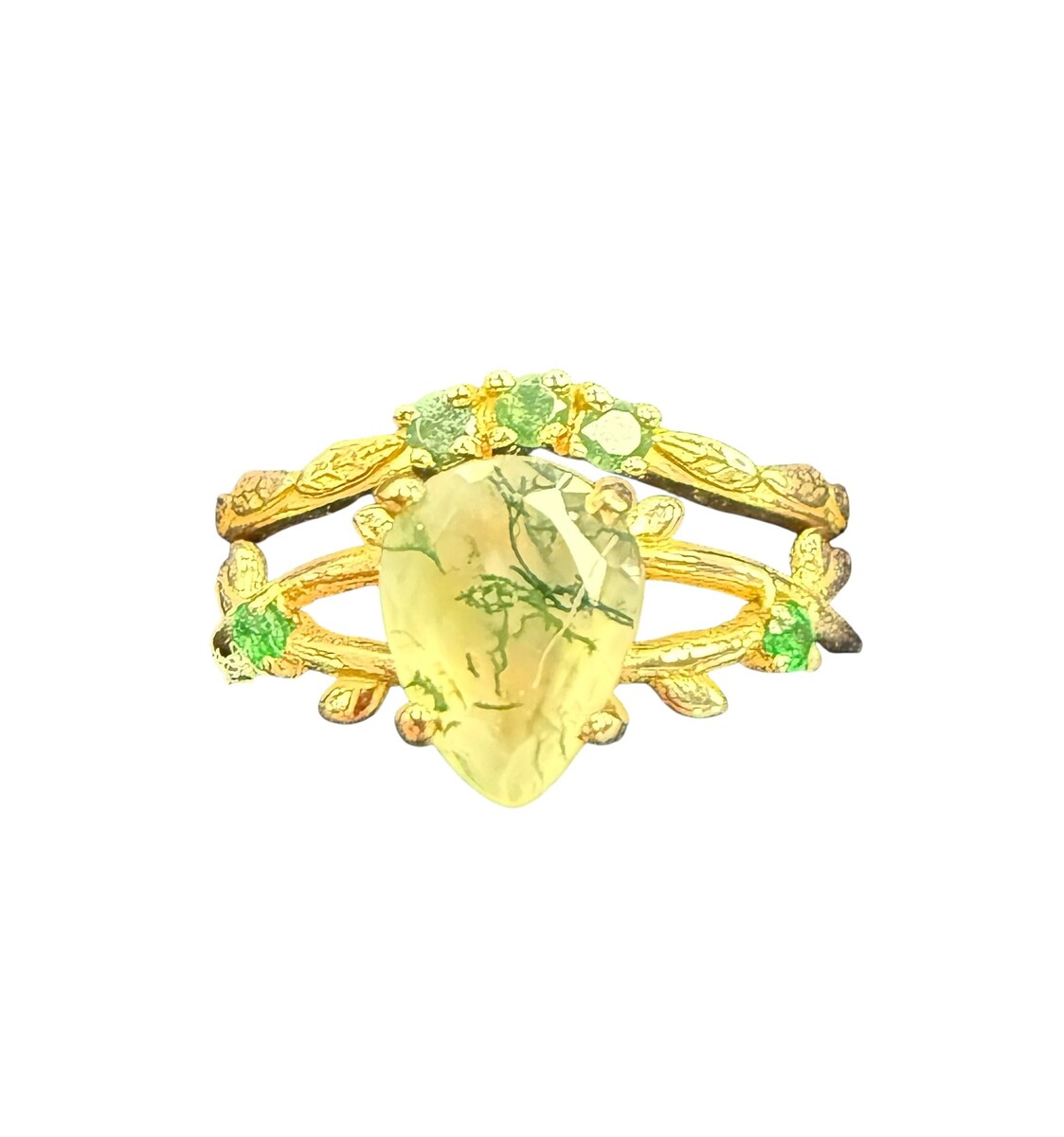 Type: Wedding setWeight: 3.2Karat: 14ktMetal: Yellow GoldGender: Women'sStyle: Wedding setSize / Length: 7.5Owner applied: NaStone 1 quantity: 1Stone 1 shape: PearStone 1 color: ClearStone 1 weight (total): 1ctStone 1 type: Cubic ZirconiaStone 2 Quantity: 5Stone 2 Shape: RoundStone 2 Color: GreenStone 2 Weight (Total): .06Stone 2 Type: Cubic ZirconiaCondition:Used