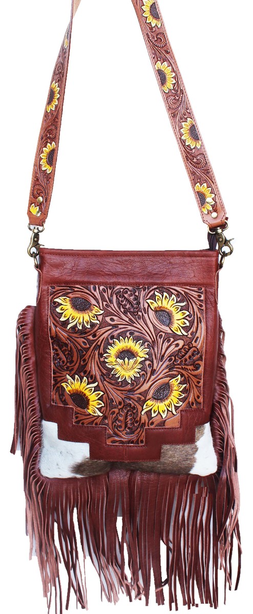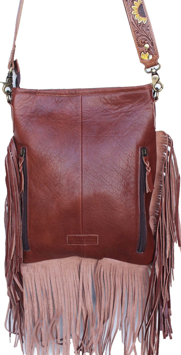 Challenger women's western versatile shoulder bag made from genuine full-grain leather to endure everyday use. Handbag features a cowhide front, hand-tooled sunflowers, and side fringe. This spacious bag is the perfect choice for work, travel, or daily use. Conveniently sized roomy bag fits most airline overhead bins for a great carry-on option. Includes a removable tooled shoulder strap. Top full zipper closure main pocket comes fully lined with brown canvas. Interior features one side zippered pocket, and two open compartments for organized storage. Backside offers concealed carry compartment with both right and left hand zipper pocket access. Cowhide is a natural product, each bag may vary slightly in shading, or color making each item a unique product. Bag measures 11-1/4" L x 14" H providing plenty of room for all of your essentials.