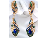 Women's earrings, 925 gold plated silver, Peacock feathers with blue and green c
