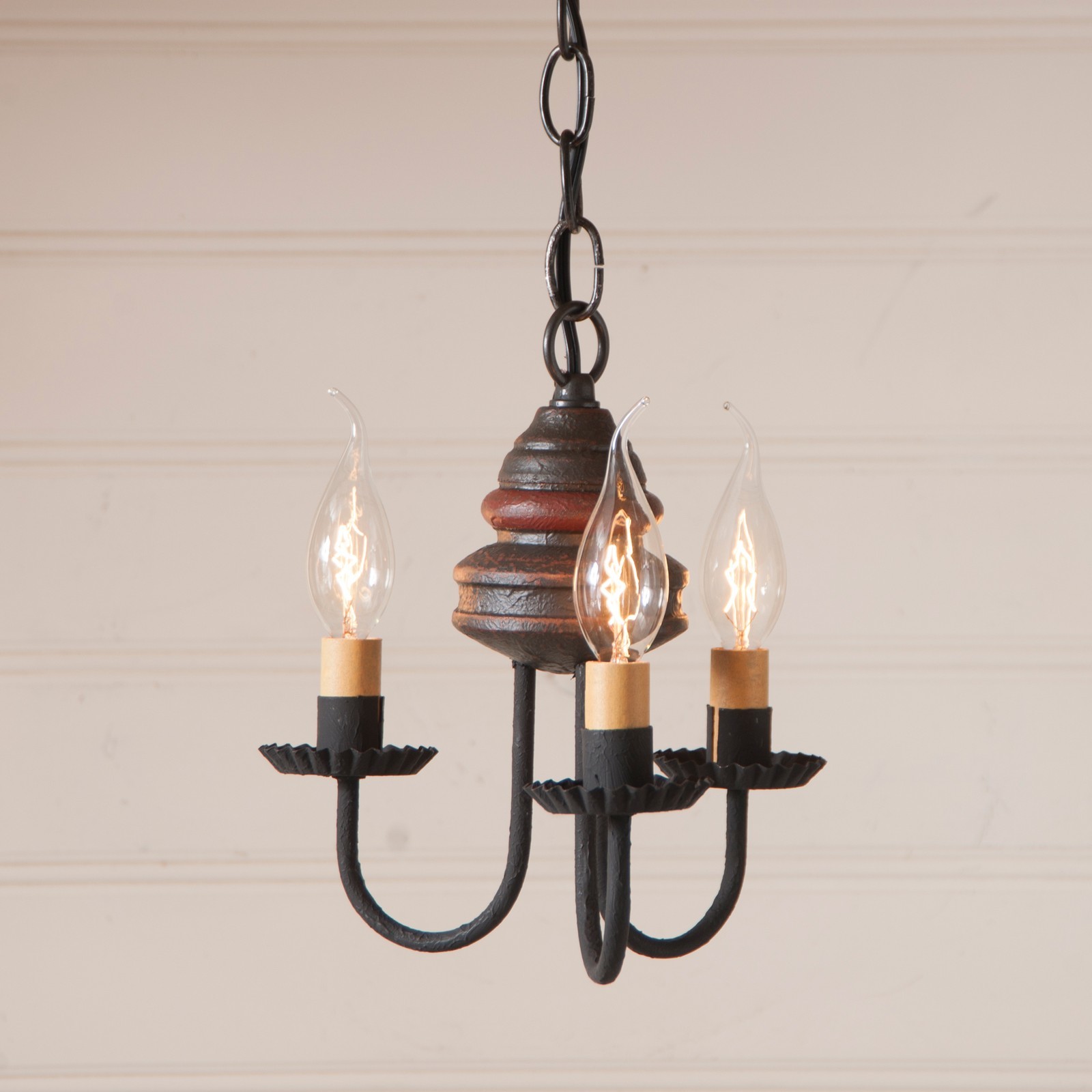 Direct wired with three candelabra sockets, 60 watts max. per arm. 7 feet of wire, 3 feet of chain, and a matching ceiling plate included. Additional chain may be ordered. Black textured arms with crimped pans. Body color is textured Vintage Americana finish with slight distressing. Handcrafted in Pennsylvania. This light is UL listed and has a 5 year guarantee.