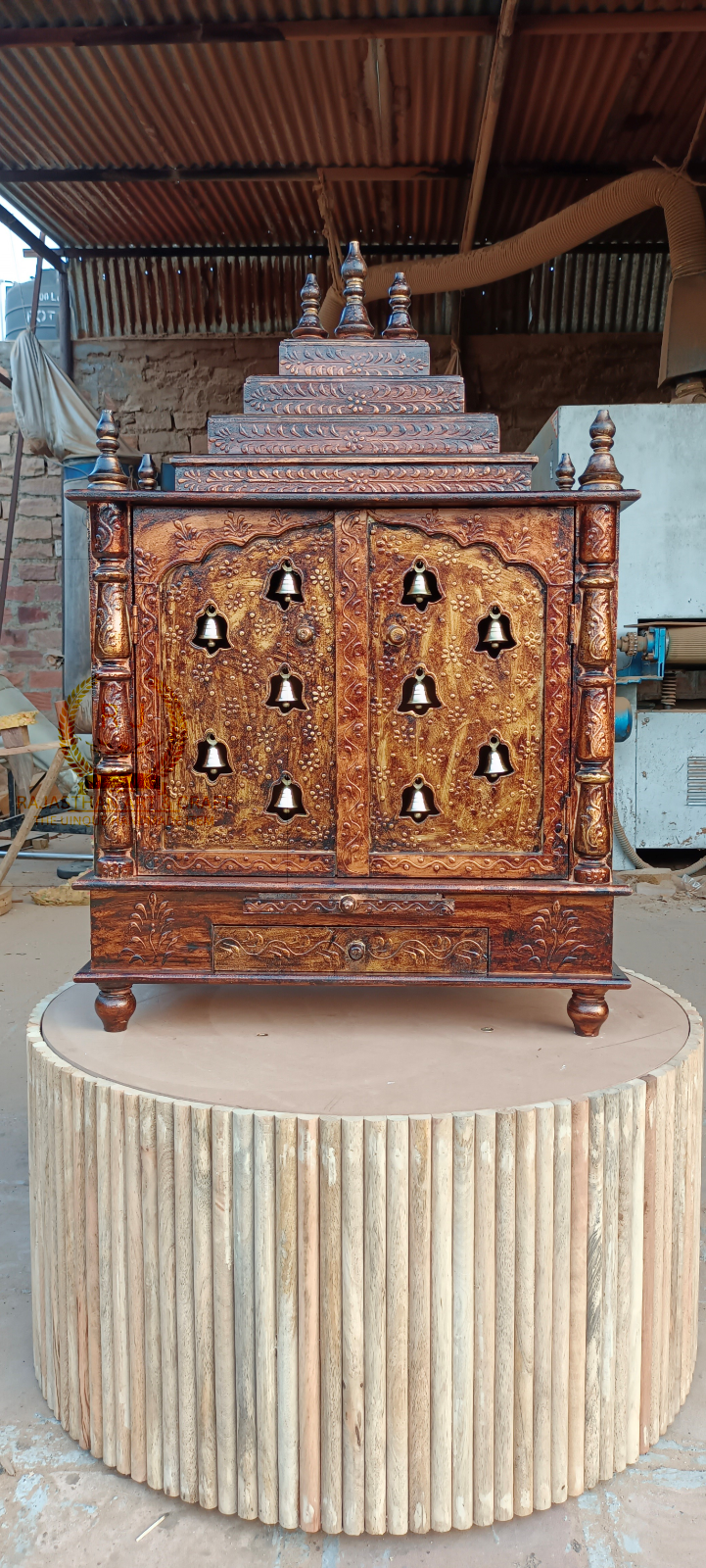 Wooden temple teak wood Open pooja temple Marbale Look White Paint Drawar pooja shelf