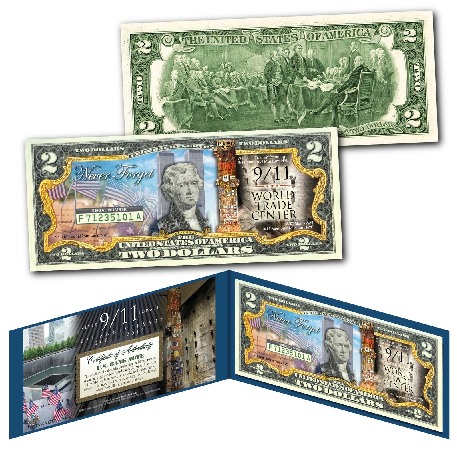 This WORLD TRADE CENTER 9/11 ? 18th ANNIVERSARY uncirculated U.S. $2 Bill is Genuine Authentic Legal Tender of the United States, which has been enhanced with colorized images to NEVER FORGET the attack of the World Trade Center on September 11, 2001. The colorized images are accomplished through a revolutionary new authentic genuine colorization process pioneered by The Merrick Mint, creating a collectible work of art. Each bill comes displayed in a blue folio with a Certificate of Authenticity to guarantee that your bills are authentic and recognized by every monetary authority around the world, therefore assuring its Collector Edition status. Each $2 Bill is in FRESH, CRISP, UNCIRCULATED condition, and was directly removed from untouched wrapped Federal Reserve sealed packs. Former U.S. President Thomas Jefferson is featured on the obverse of the note, along with the special colorization overlay. The Signing of the Declaration of Independence by John Trumbull is featured on the reverse. It is the only U.S. Currency note that features two Presidents, John Adams and Thomas Jefferson, and it is one of the most rarely seen BILLS in circulation and actual use. The Last Column, standing in the center of the 9/11 Memorial Museum?s Foundation Hall, is covered in thousands of markings and tributes placed on the beam by workers and family members. The story of how and why the markings began to appear links back to one fireman?s personal and practical act.
