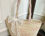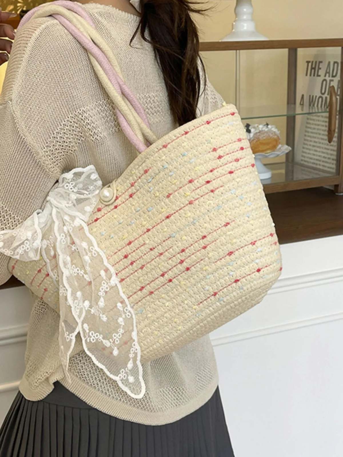 - Woven Straw Shoulder Bag with Lace Bow Detail