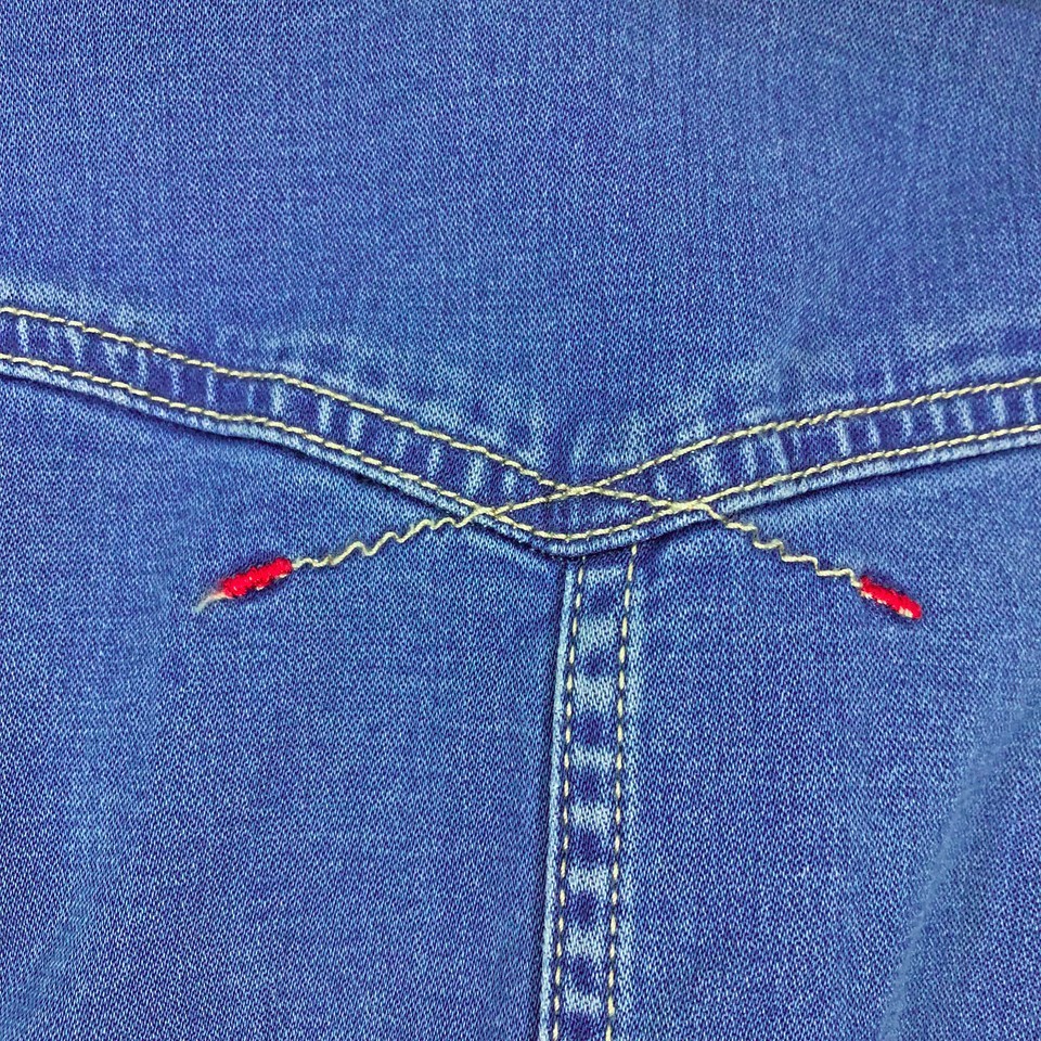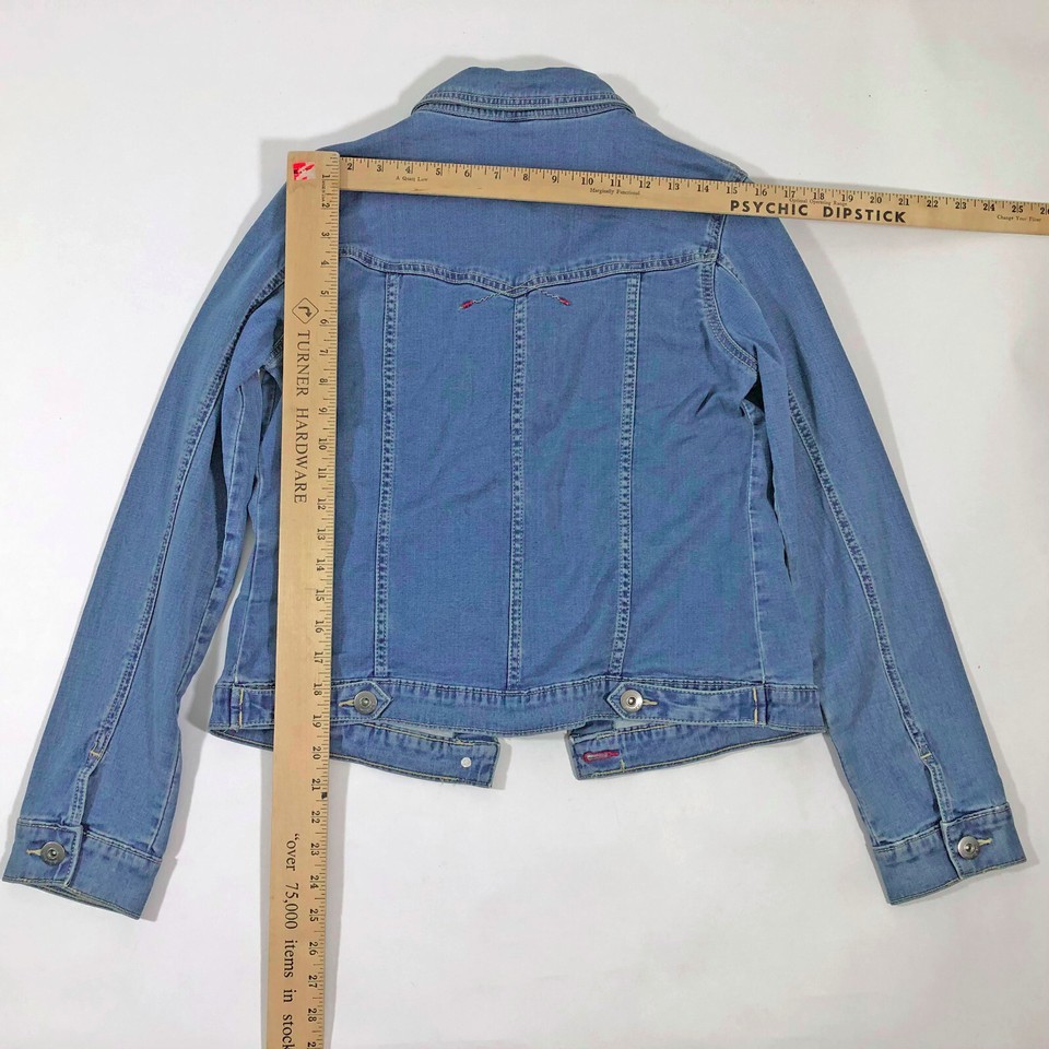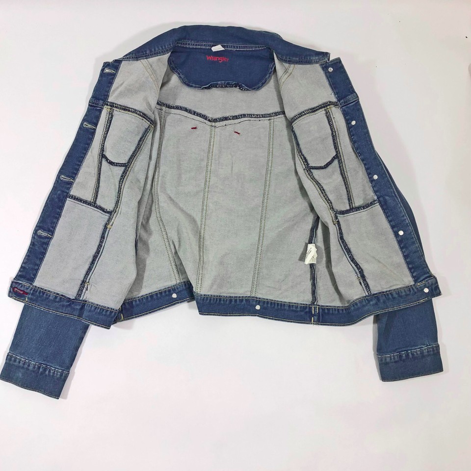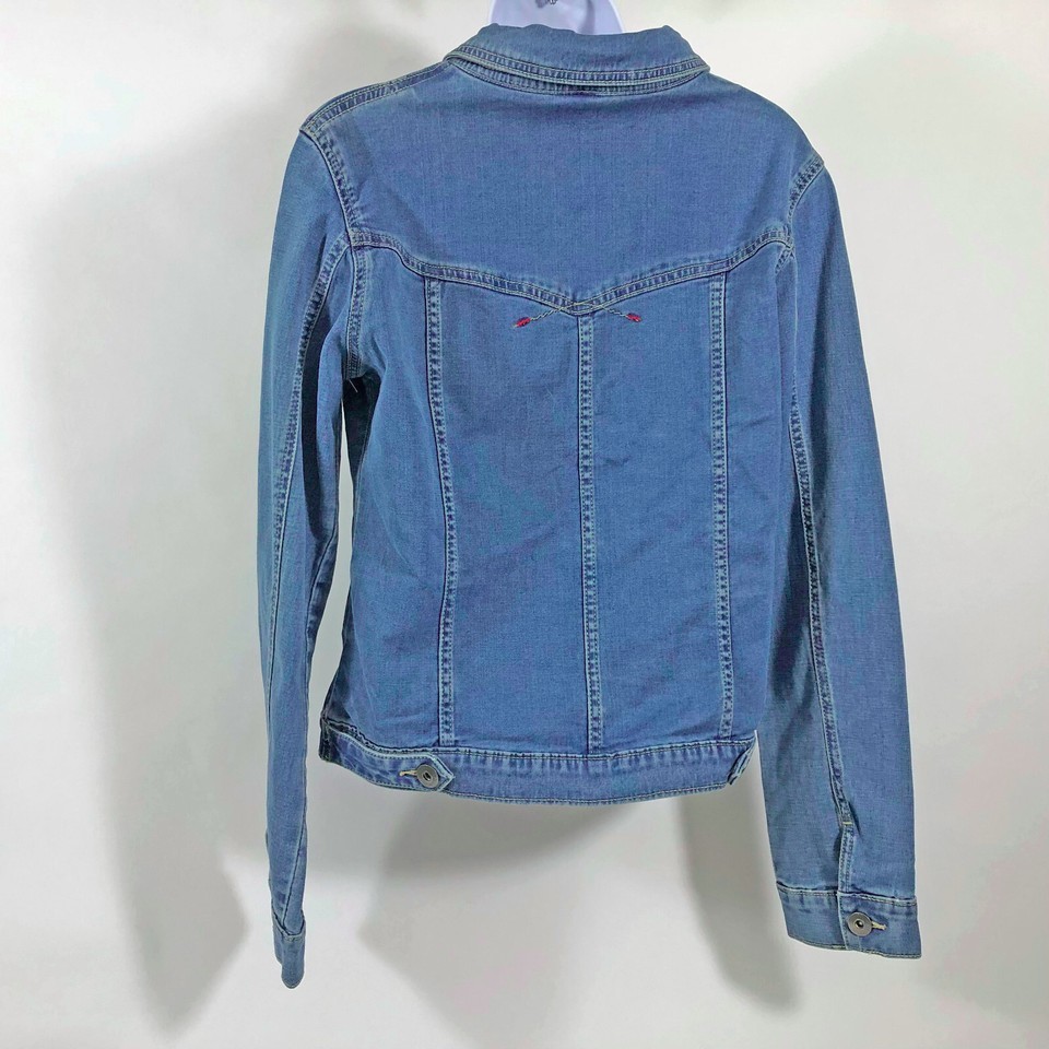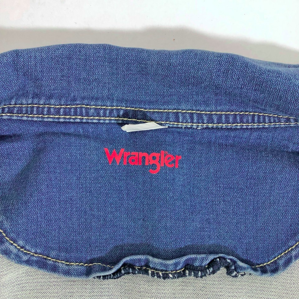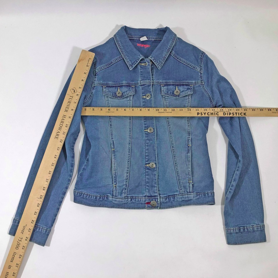 Wrangler medium wash blue denim jean jacket has small decorative red embroidery on the back. This is a classic Wrangler jean jacket with some stretch to it. NO rips, stains or tears. You can't miss with wearing this EUC, Excellent Used Condition jacket for your casual jacket needs. Flap collar and button down front Brand Wrangler Made in Bangladesh US size Women's Medium 6 pockets Flap collar Light Blue color 99% cotton, 1% Spandex Arm pit to pit 17 inches Across the shoulders 15.5 inches Shoulder to hem 19 inches SKU NN-0-09-23-040