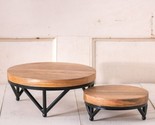 Here is a pair of new versatile risers, ideal for home or office. Made from wood and metal, it comes in two sizes for flexible styling. Its sturdy construction ensures durability. Featuring stained solid wood tops on wrought iron bases, these risers are perfect for country decor. Display potted florals, candles, dolls, or pictures. Use as a centerpiece or to add height to your counter or table, adding rustic charm to any room.