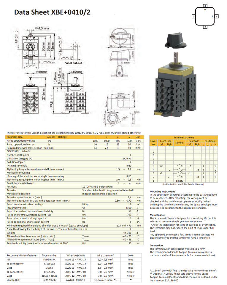 1PCS XBE+0410/2 X1000 Santon 4-Pole DC PV1 Isolator Switch, 50?A, 1100?V DC