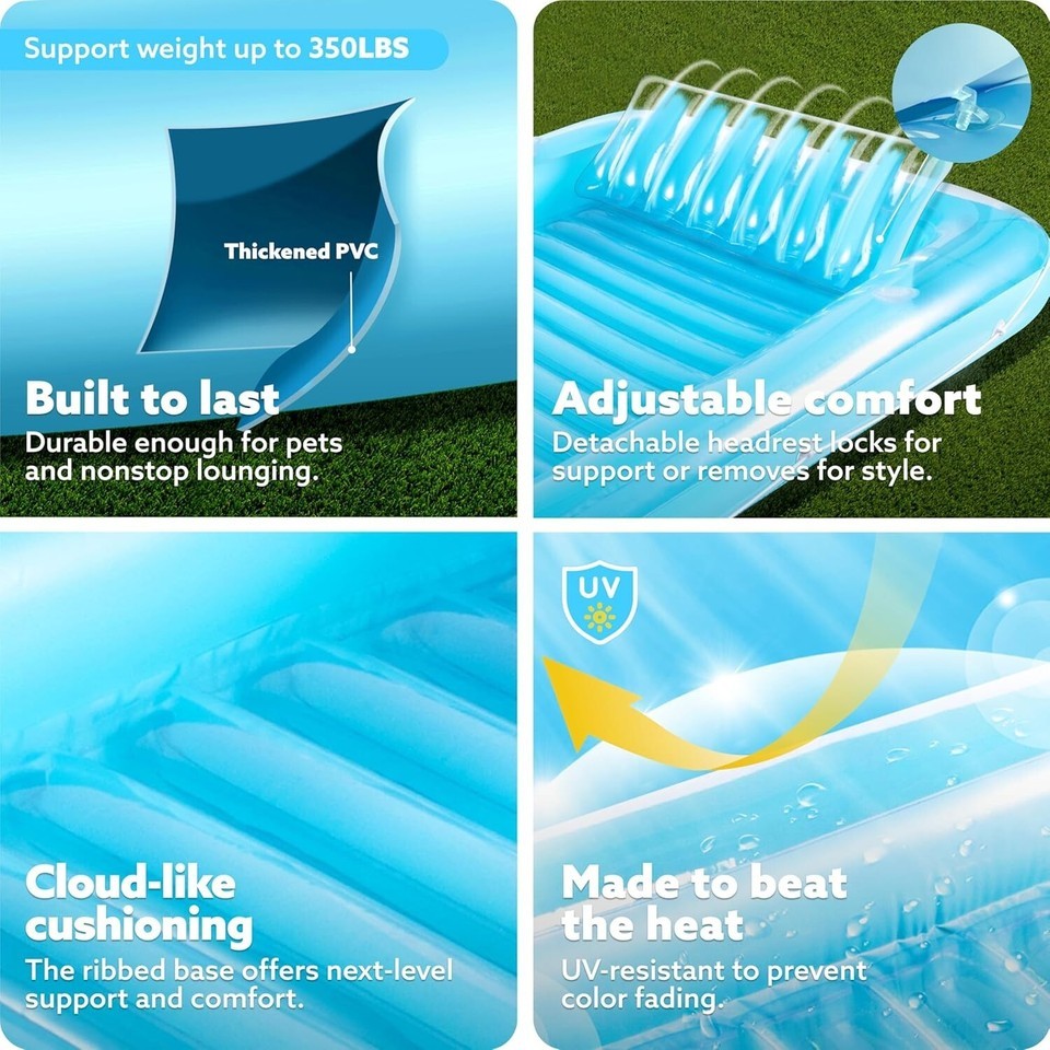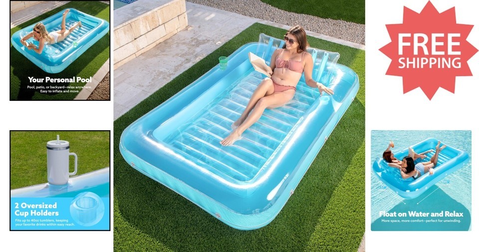 Enjoy the summer with our extra-large inflatable pool float, measuring 85" x 57"?large enough to comfortably hold two people. Crafted from durable, UV-resistant PVC, it features an inflatable base for added comfort, a removable headrest, and two convenient cup holders to keep your beverages close. The integrated tie points and wrap-around grab line ensure stability and easy maneuverability. Fill it with water for a cooling suntan tub experience, or use it as a pool float, lounger, or even a kids' ball pit. Designed for ultimate relaxation and versatility, this -quality float promises hours of sunbathing fun.