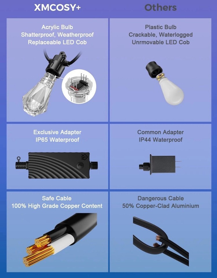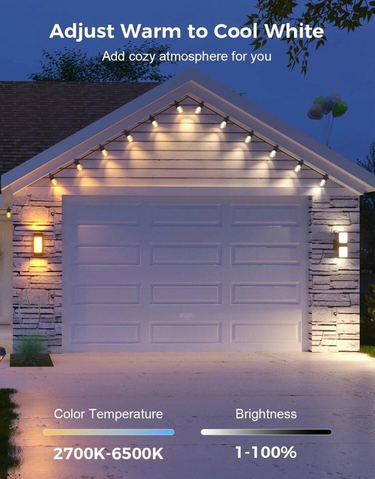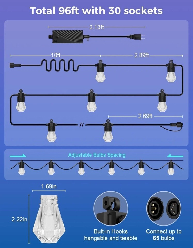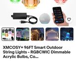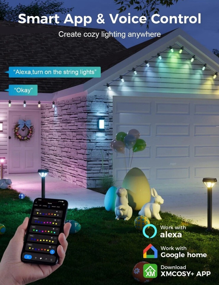 The XMCOSY+ 96FT Smart Outdoor String Lights feature multi-color RGBCWIC dimmable acrylic bulbs, providing a vibrant and customizable lighting experience. With 30 light sources and a 96ft size, these retro-style lights are perfect for various occasions such as Halloween, housewarming, Christmas, New Year, and Thanksgiving. The string lights can be controlled using the XMCOSY app, Amazon Alexa, voice control, or button control, making it convenient for users to adjust the brightness and color temperature (6500.0) to suit their preferences. The lights are both energy-efficient with a 15.0 wattage and suitable for outdoor and indoor use.Return Policy Details: