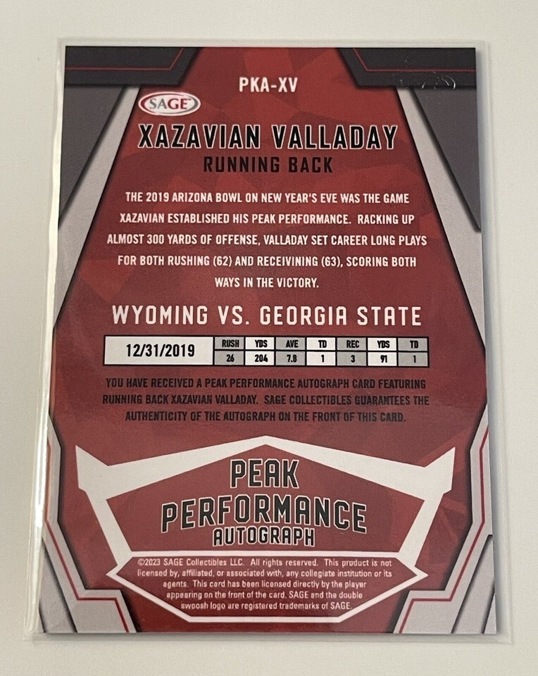 - Xazavian Valladay Rookie Auto 2023 SAGE High Series Peak Performance - PKA-XB RC