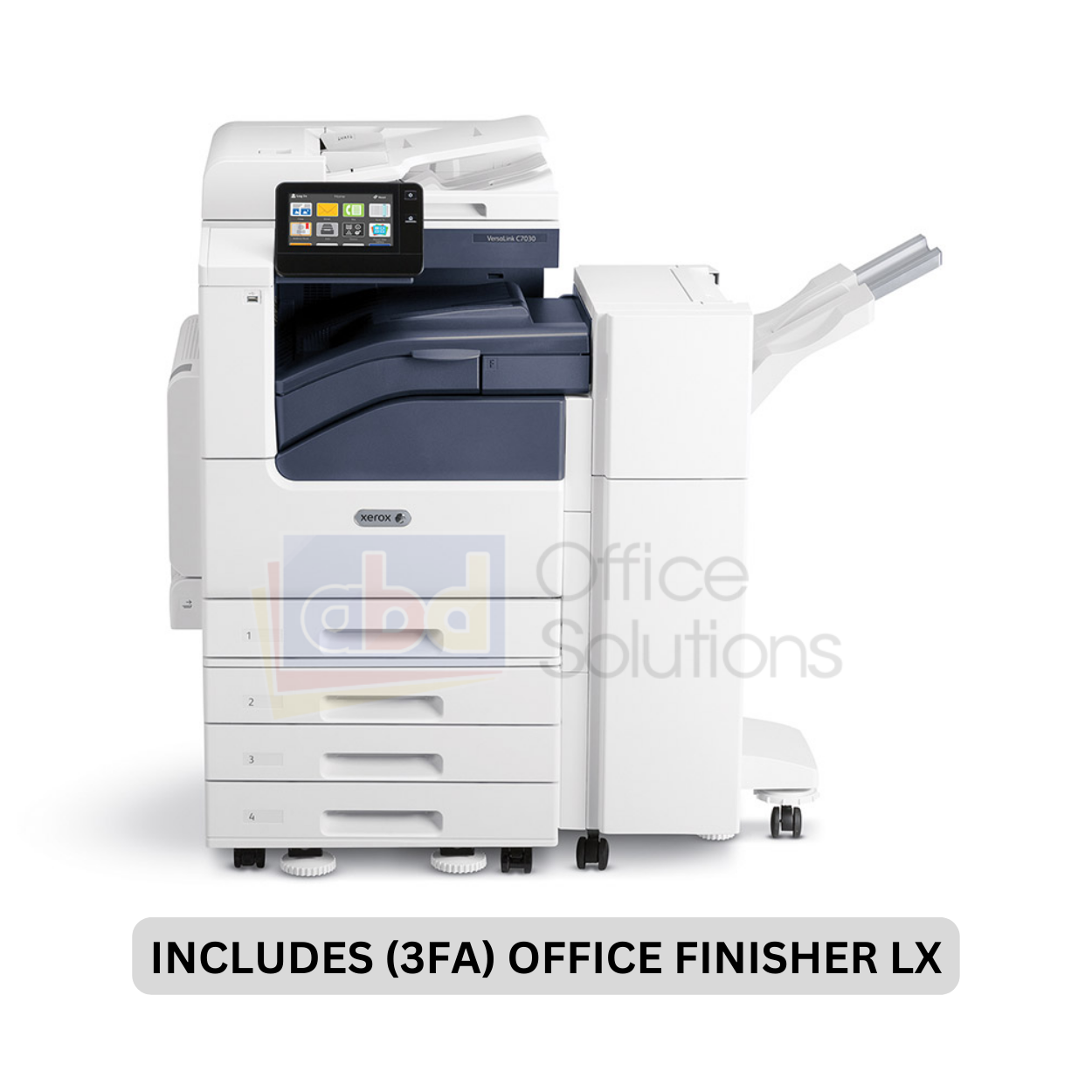Print, Scan, Fax, 2000 Sheets Office Finisher LX (3FA), 4 x 520 Sheets Paper Drawers, and 100 Sheets Bypass Tray.