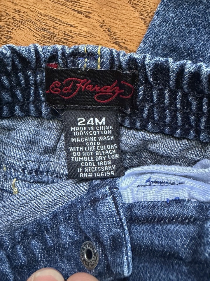 The Y2K Ed Hardy Tiger Embroidered Jeans in size 24 months are a stylish and playful choice for your little one. With a unique tiger button closure and elastic back foe comfort