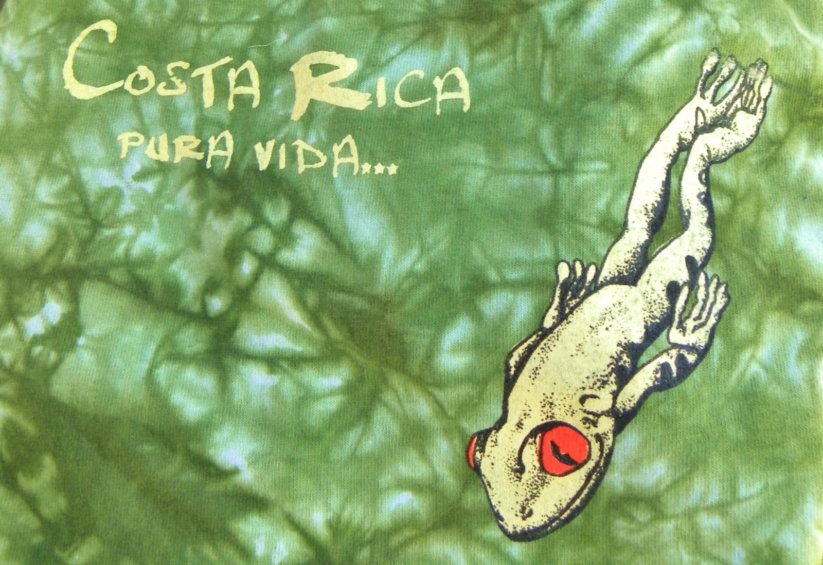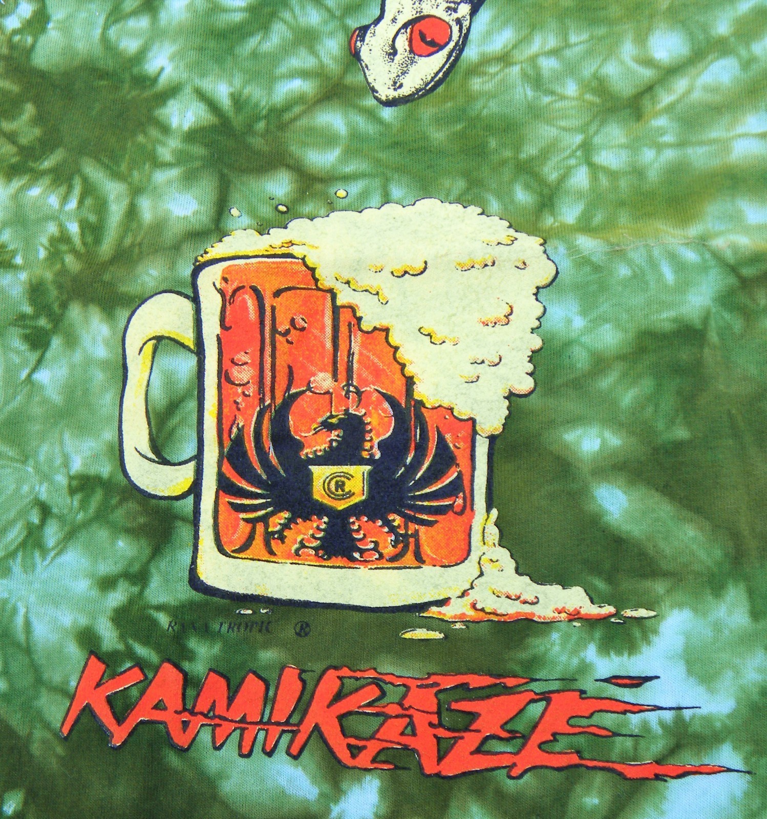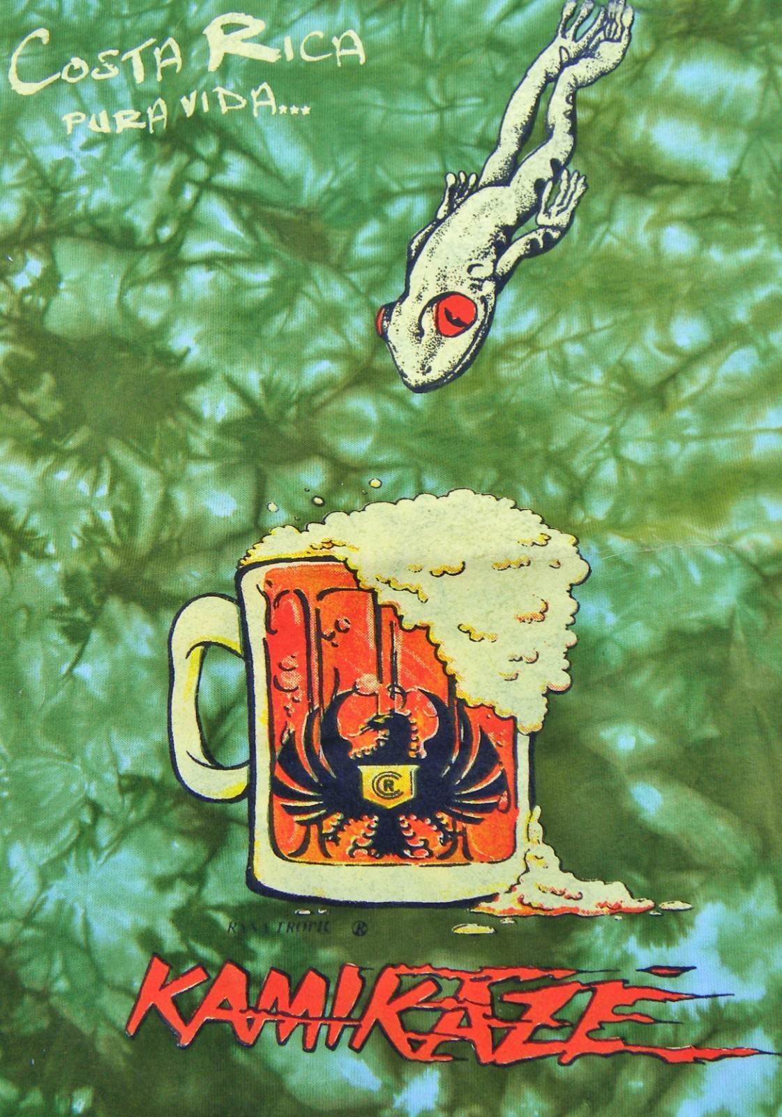 You are viewing a preowned Vintage Y2k Tie-dyed Tee in size Adult Large by Rana Tropic (Costa Rica). Fabric 100% preshrunk Cotton. The moss green/white has colorful "Raised" Graphics featuring a very RAD red-eyed " Kamikazee" Frog. LOTSA Graphics front and rear which the photos portray well. Vintage NOS Condition: This tee has not been worn, but has been stored in plastic case. PLEASE view at all Photos so that you will know exactly what you are buying. OUTER Measurements: Actual Chest: 41"~Rear Length: 30". Thanks for looking!