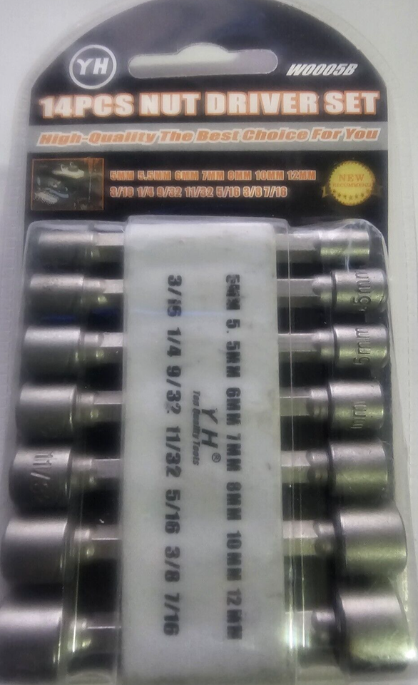 You are Buying a brand New And Factory Sealed YH 14PC Power Nut Driver Drill Bit Set Socket Bit Adapter metric SAE Socket for Wrench Screw 1/4" Driver Hex......... nut drivers includes: SAE: 1/4,5/16,3/8,7/16,15/32 1/2in. Metric: 6,8,10,11,12 13mm ; 2in. bits: 1/4in. PH2 Fits most powered corded or cordless drills. Strong inner Hexagon sleeve..... Anti rust, anti slip, flexible. Mounted on a black clip, easy to use and storage Applicable for installing in those hexagon tools, such as pneumatic screwdriver, electric screwdriver, pneumatic drill, electric drill, pistol drill, manual screwdriver, etc. It's widely used in household DIY, auto parts, woodworking, professional machine repairing, etc........