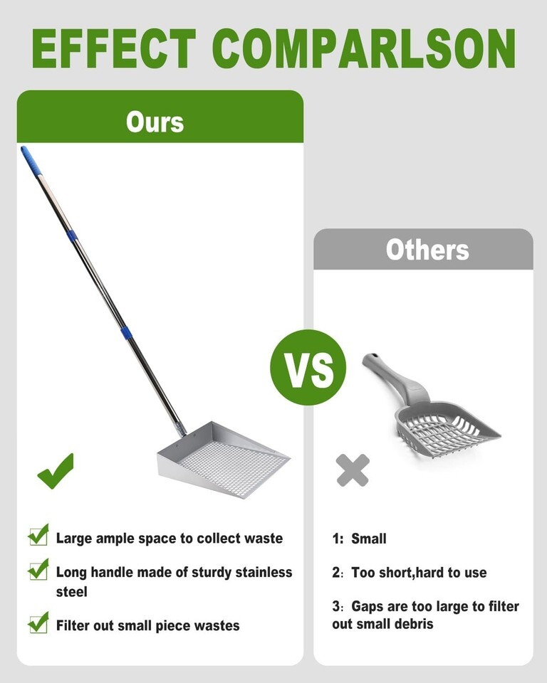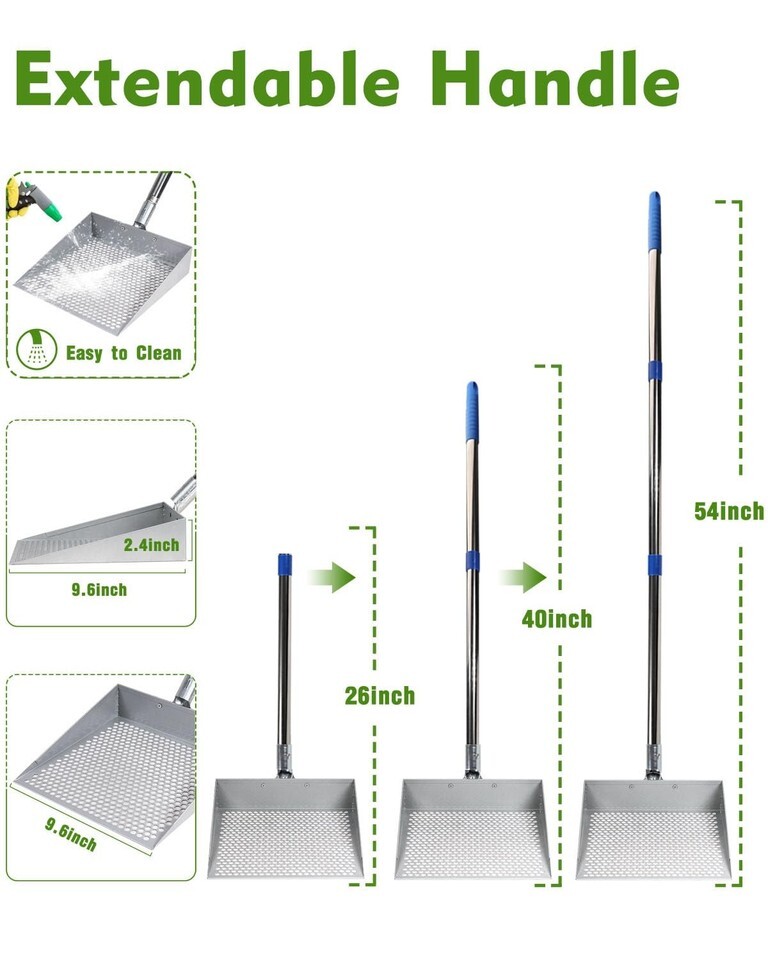 Extended Handle for Ease of Use Equipped with a 44.5in long handle made of sturdy stainless steel, this litter scooper allows you to clean the chicken coop without the need to bend over excessively. This design reduces strain on your back, ensuring comfort during use and making it one of the most practical chicken coop cleaning tools.