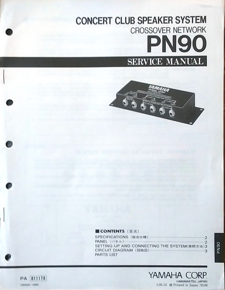 Yamaha service manual for the Yamaha PN90 Crossover Network for a Concert Club Speaker System. This service manual is in very good condition, and includes full specs, panel, setting up, connections, a circuit diagram, exploded views, and a full parts list. Original Yamaha document, printed in Japan, from 1993.