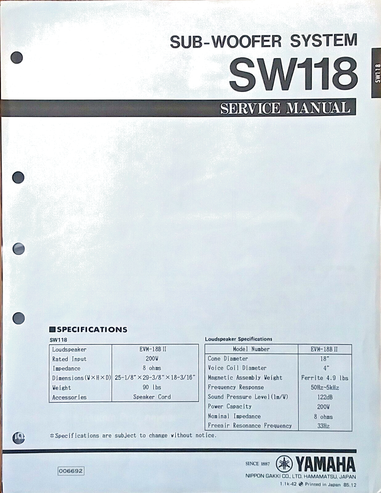 - Yamaha SW118 Sub Woofer Speaker System Original Service Manual Booklet 1985 Jap.