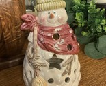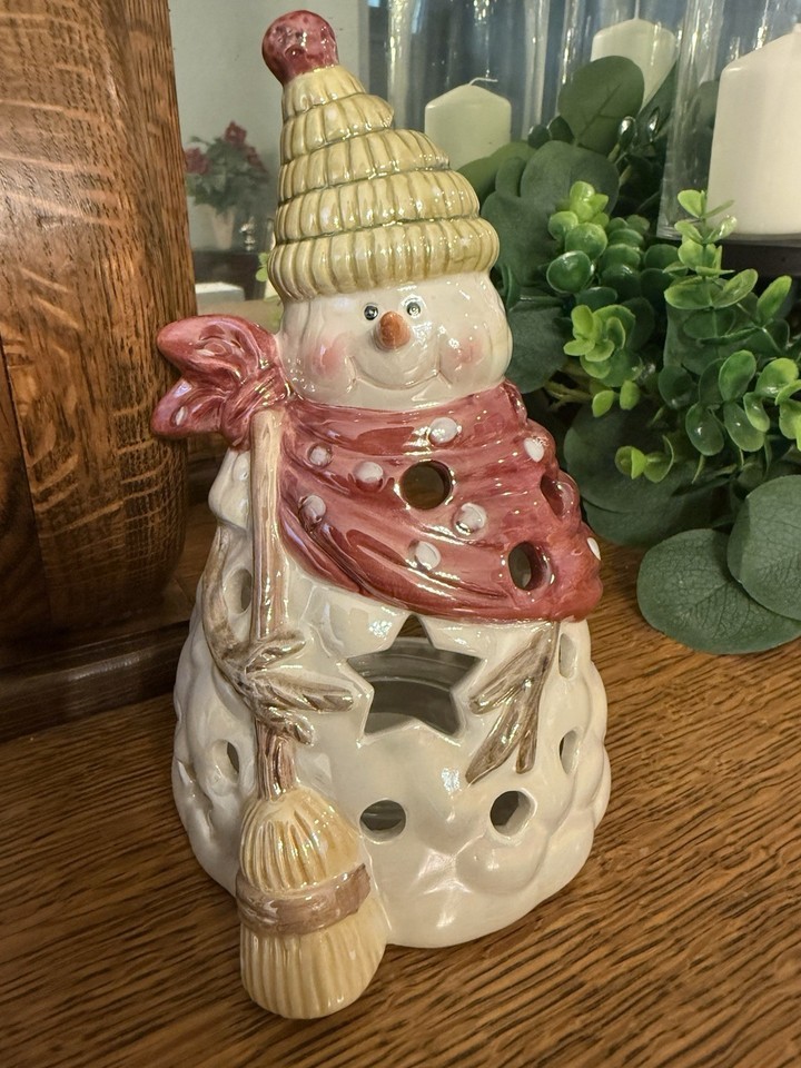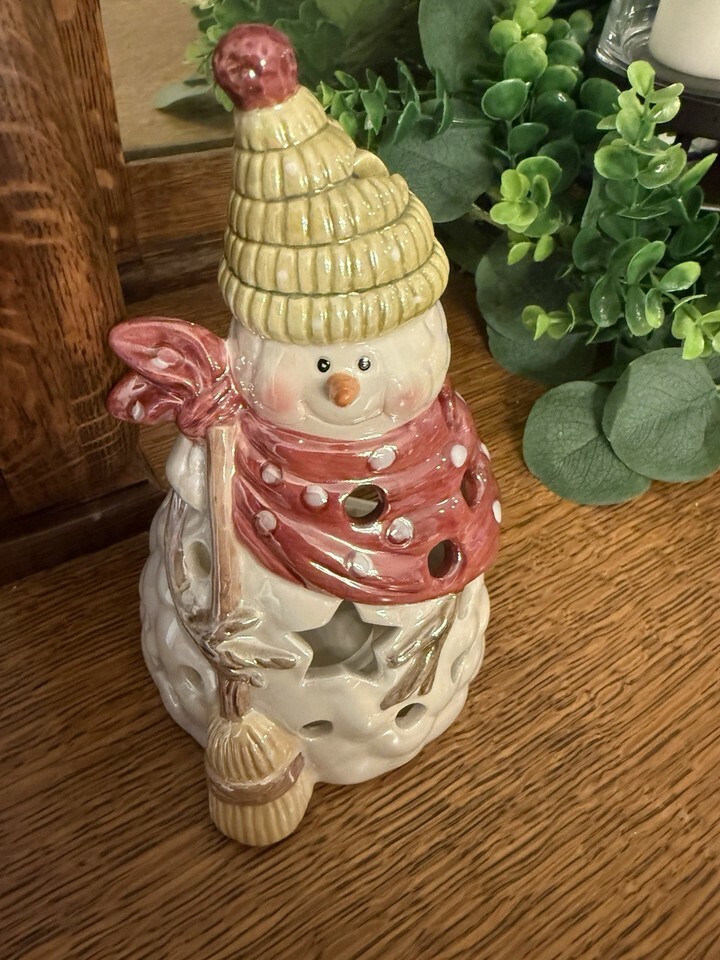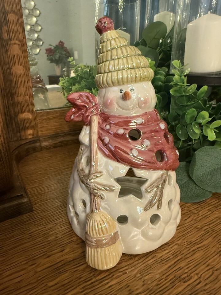 EXCELLENT CONDITION! This Yankee Candle Snowman Iridescent Tea Light Candle Holder is a charming addition to your Christmas winter decor. Made of ceramic with a multicolor design, this freestanding candle holder features a snowman character and is suitable for tea light candles. The item stands at 7 inches. Perfect for adding a festive touch to any room in your home, this Yankee Candle Holder is a must-have for the holiday season.