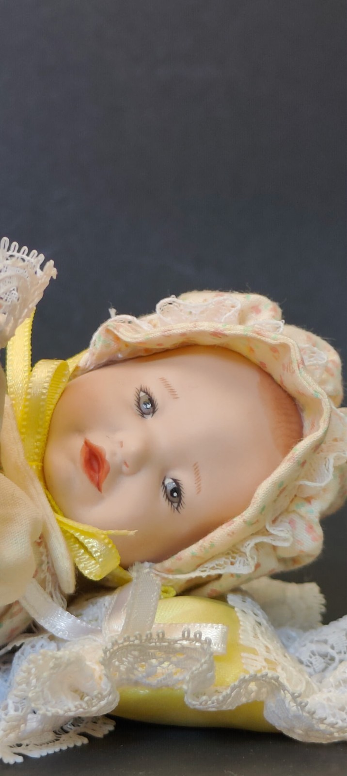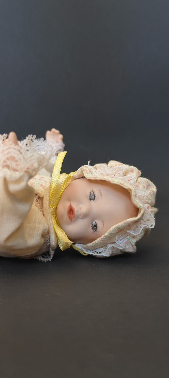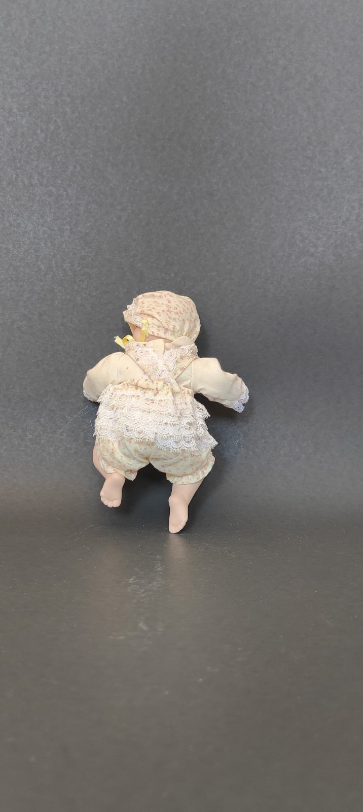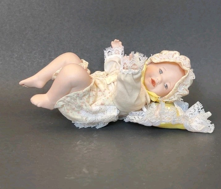 The product is a vintage 1990 Ashton Drake doll named "Lisa" from Yolanda Bello's Picture Perfect Babies series. The set includes a 6-inch girl doll and a pillow, packaged in its original opened box with a Certificate of Authenticity. This doll features a light complexion, represents a Caucasian ethnicity, and is a collectible piece from the 1990s. Perfect for all occasions, this doll embodies the theme of babies and is a must-have for collectors of vintage dolls and doll playsets.