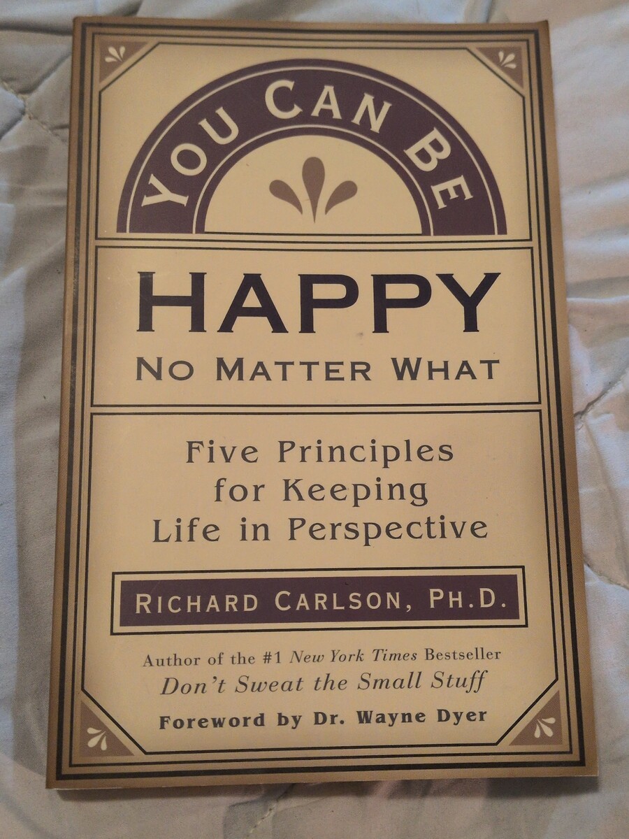 1997 Softcover Edition of You Can Be Happy No Matter What: Five Principles for Keeping Life in Perspective by Richard Carlson Ph.D. Forward by Dr. Wayne Dyer. 141 pages From back cover: IN this book, Dr. Richard Carlson reveals a profound break in thought in human psychology. Most of us believe that our happiness depends on outside circumstances and that by solving our problems, improving our relationships, or achieving the success we will find contentment. but Dr. Carlson clearly shows that happiness has nothing to do with forces beyond our control. See the above photo for more content.