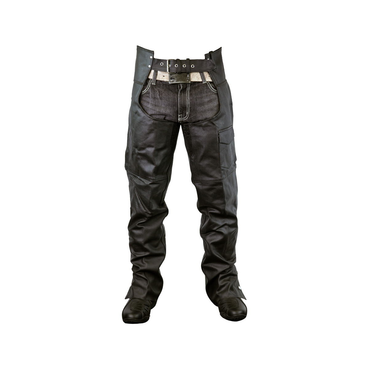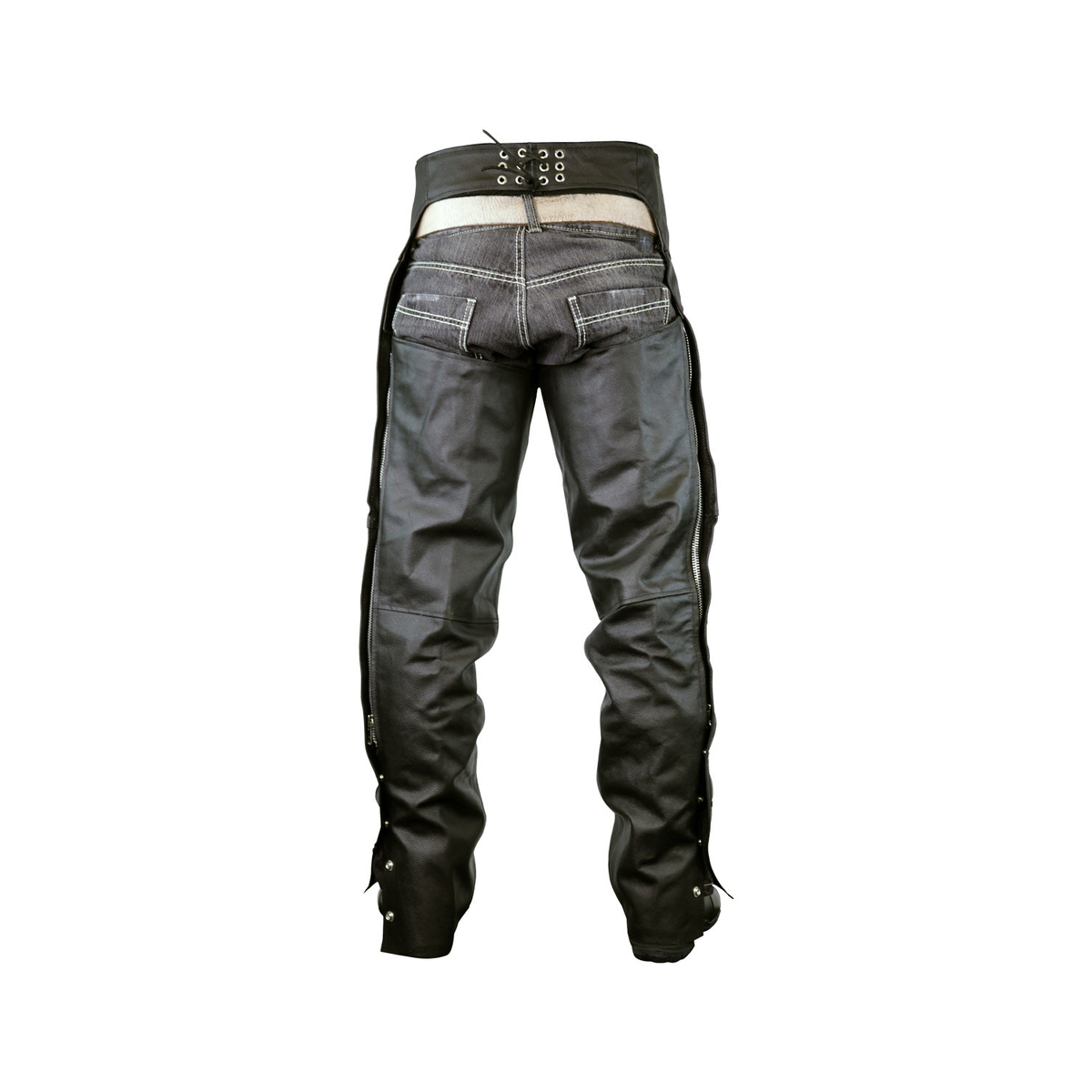 The Zip-Out Insulated and Lined Plain Biker Leather Chaps from Vance Leather are a must-have classic for all bikers who won t let a little cold weather get in the way of a good ride. Just zip in the lining on those days or mornings when the weather is brisk. Then zip them out as the weather warms up. These plain chaps are crafted from black leather and boast zippers on the sides. These Zip-Out Insulated and Lined Plain Biker Leather Chaps are designed to fit almost every body type male, female, large and small. Sizes range from 3XS to 6XL, and the adjustable waist features a belted front and a lace-up back panel for a custom fit. In addition, the length of these chaps can also be cut to fit.