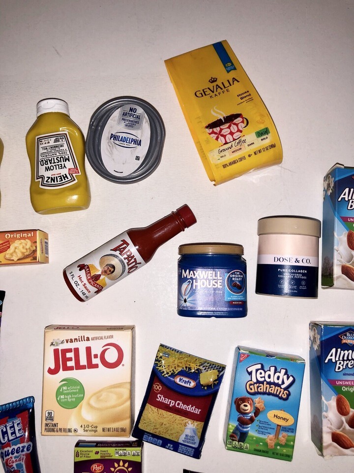 Experience the thrill of a miniature grocery store with this Zuru Mini Brands lot of 23 toys. This colorful and vibrant set includes everything from food items like jello, coffee, mustard, and hot sauce to toys like guacamole. Perfect for kids aged 7+ this set will provide hours of fun and imaginative play. Whether your child is setting up a pretend store or playing with their friends, these miniature toys will add a touch of realism to their playtime. With a variety of items to choose from, they can create their own unique shopping experience. Add this Zuru Mini Brands lot to your child's toy collection today!