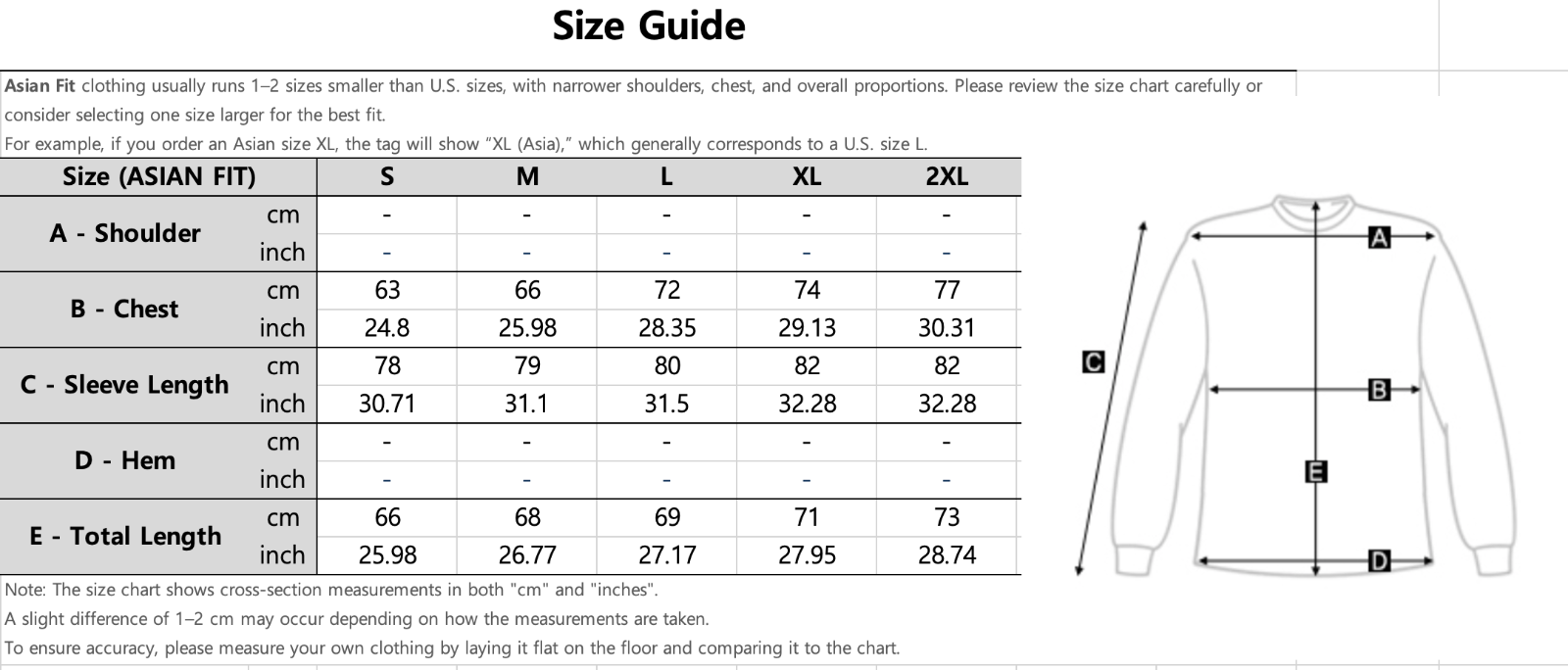 Asian Fit refers to clothing tailored for body shapes commonly found in Asian populations. These items typically run 1-2 sizes smaller than U.S. sizes, with narrower shoulders, chest, and overall proportions. Please check the size chart carefully or consider sizing up for the best fit.