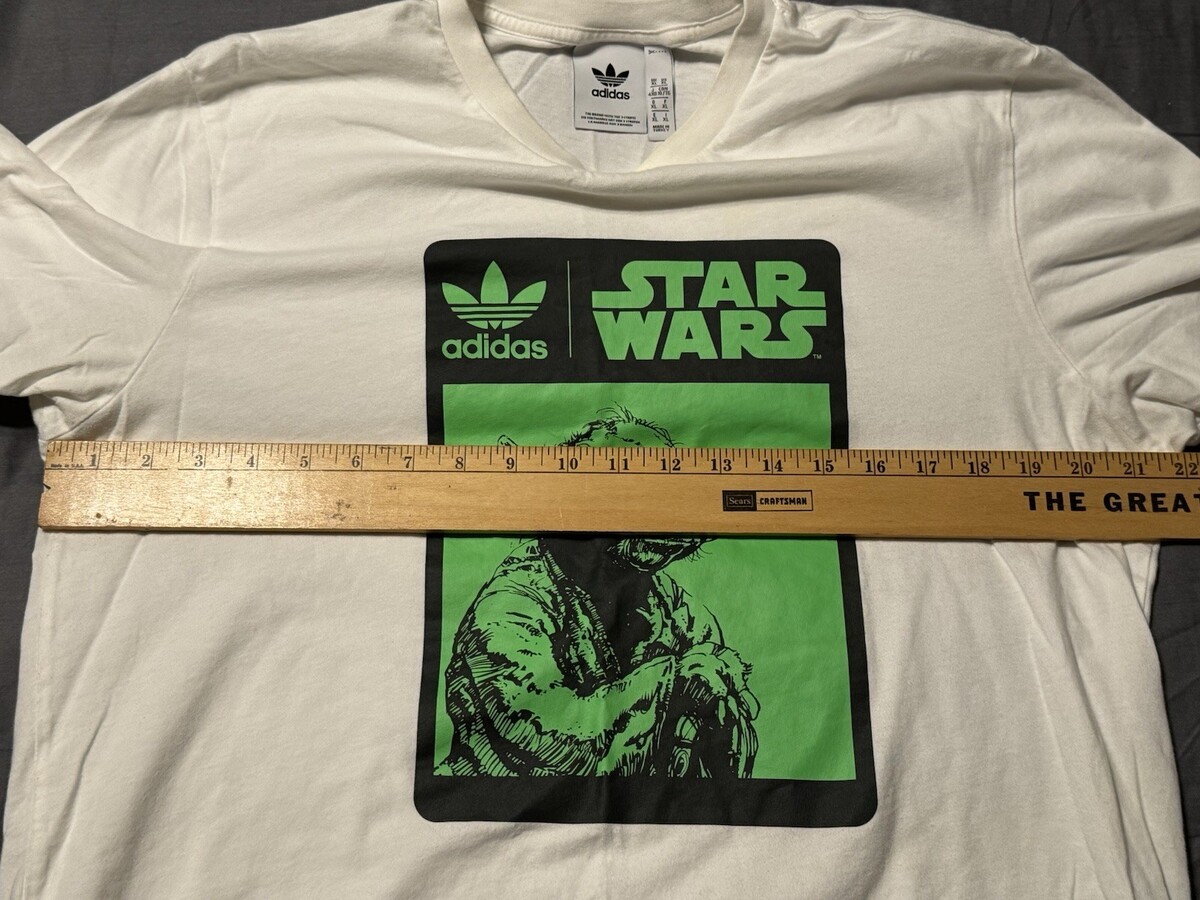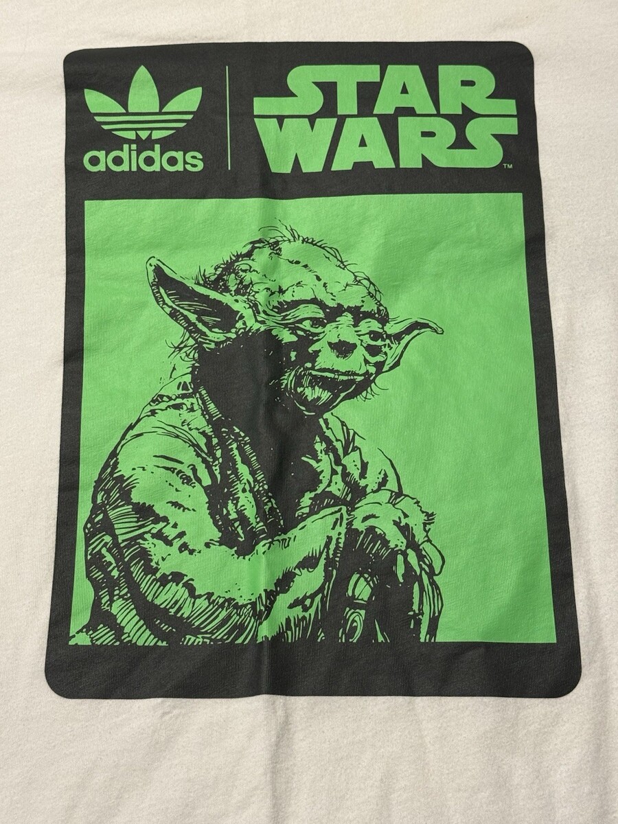 Awesome adidas Originals x Star Wars graphic tee featuring a bold green Yoda design on a white shirt. Men?s size XL. Pre-owned and in great shape with light signs of wear. No holes or major flaws noted. Details: ? Men?s XL ? White short-sleeve tee ? adidas Originals x Star Wars collaboration ? Large green Yoda graphic ? 100% cotton ? Made in Turkey ? Pre-owned, normal light wear ? see photos Great piece for any Star Wars or adidas fan.