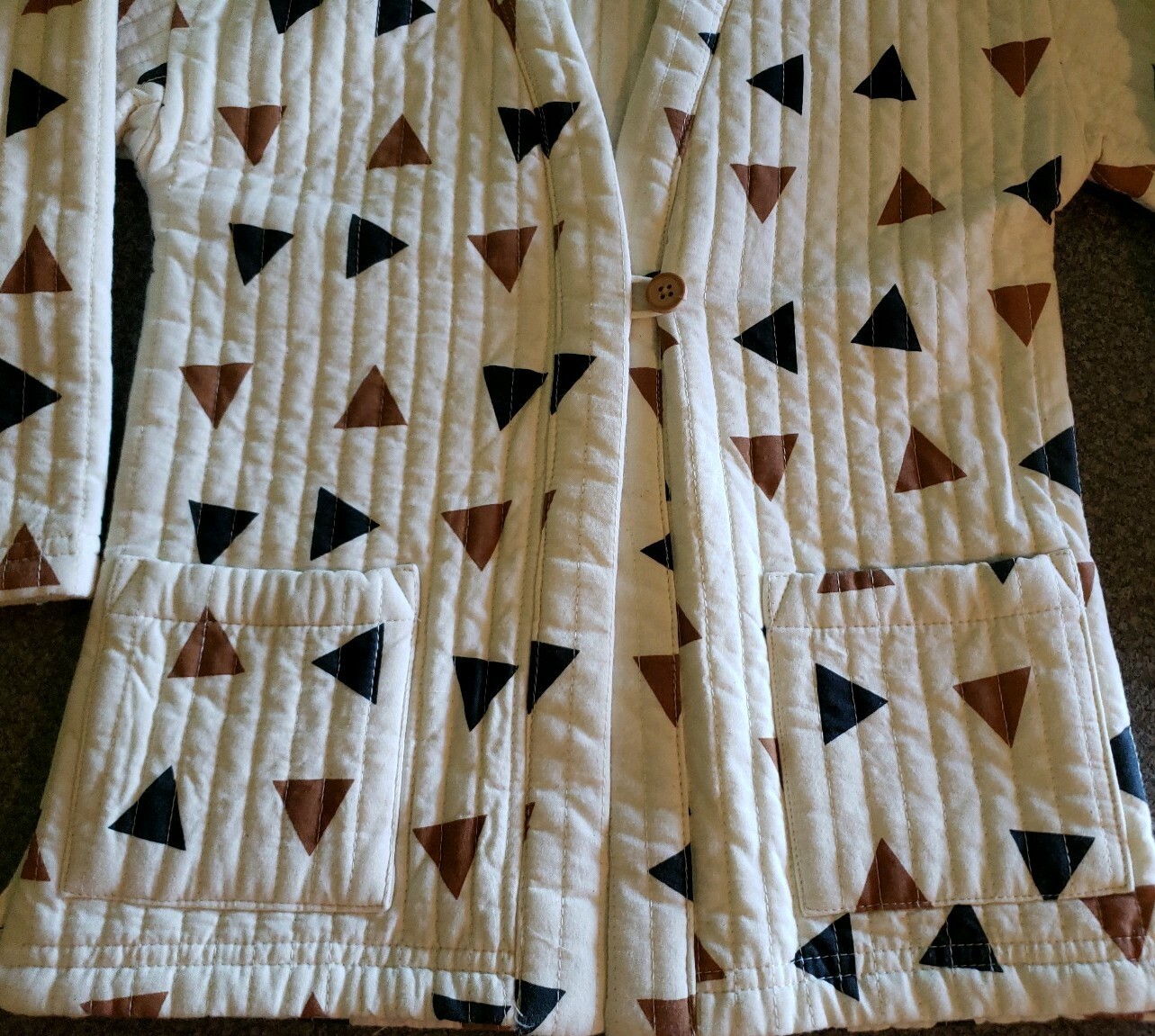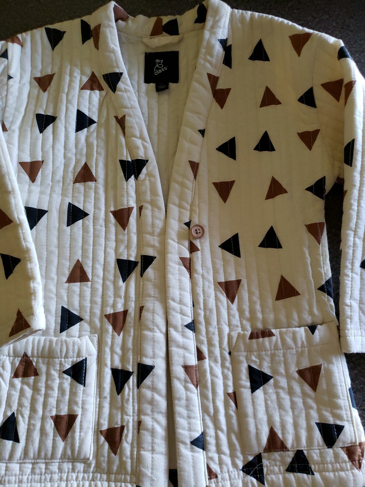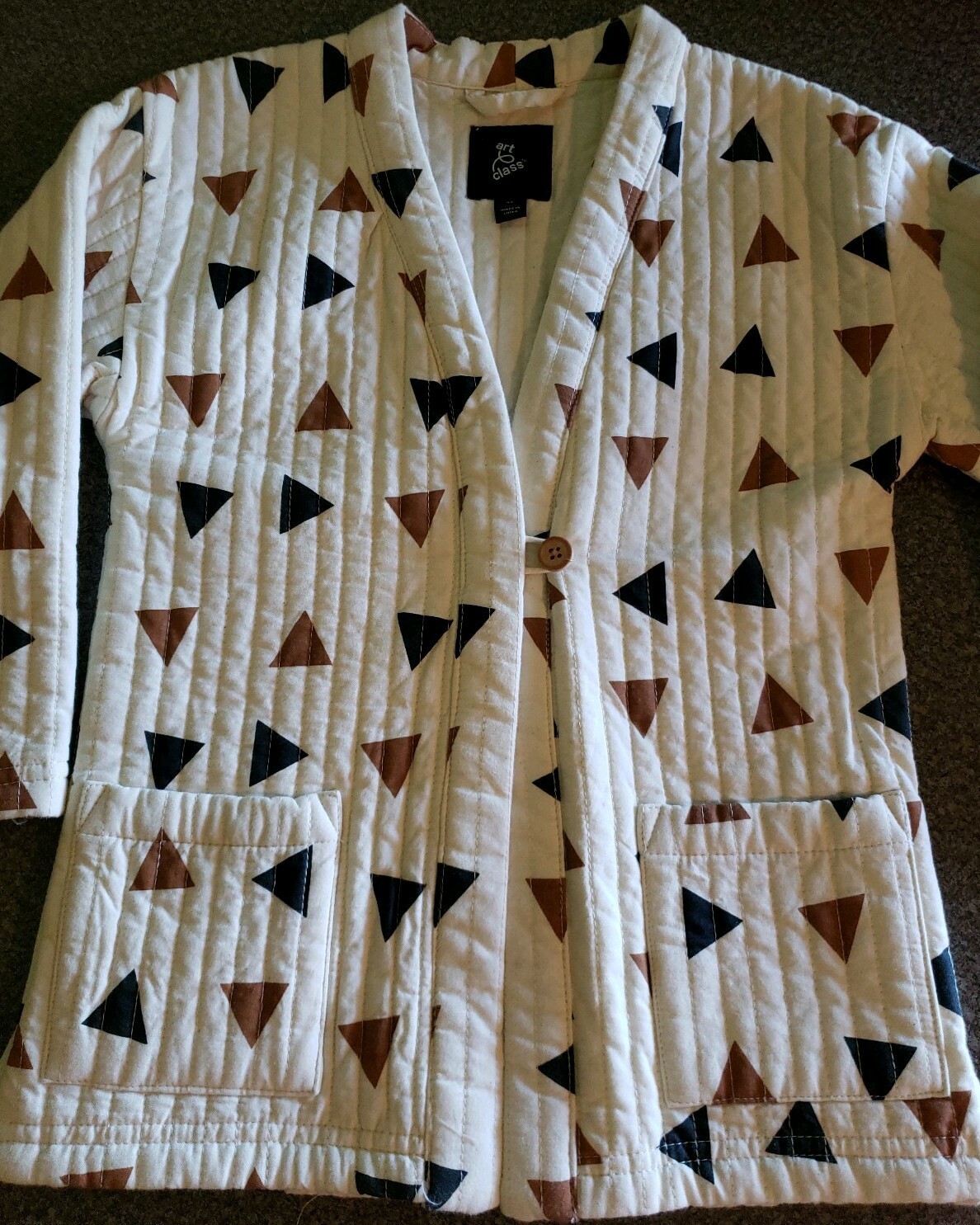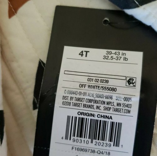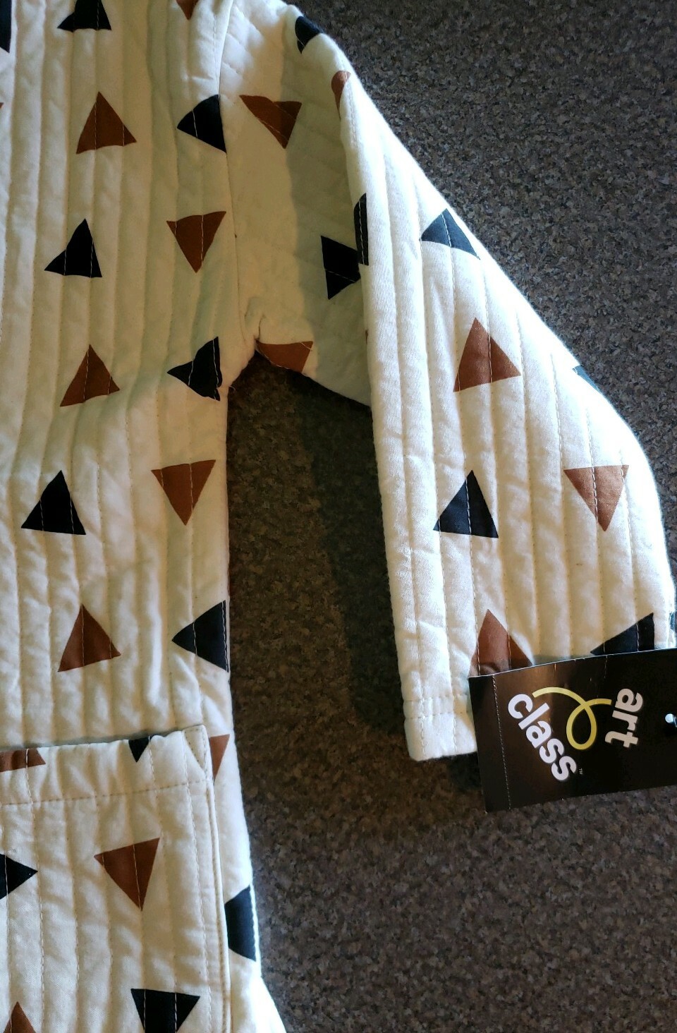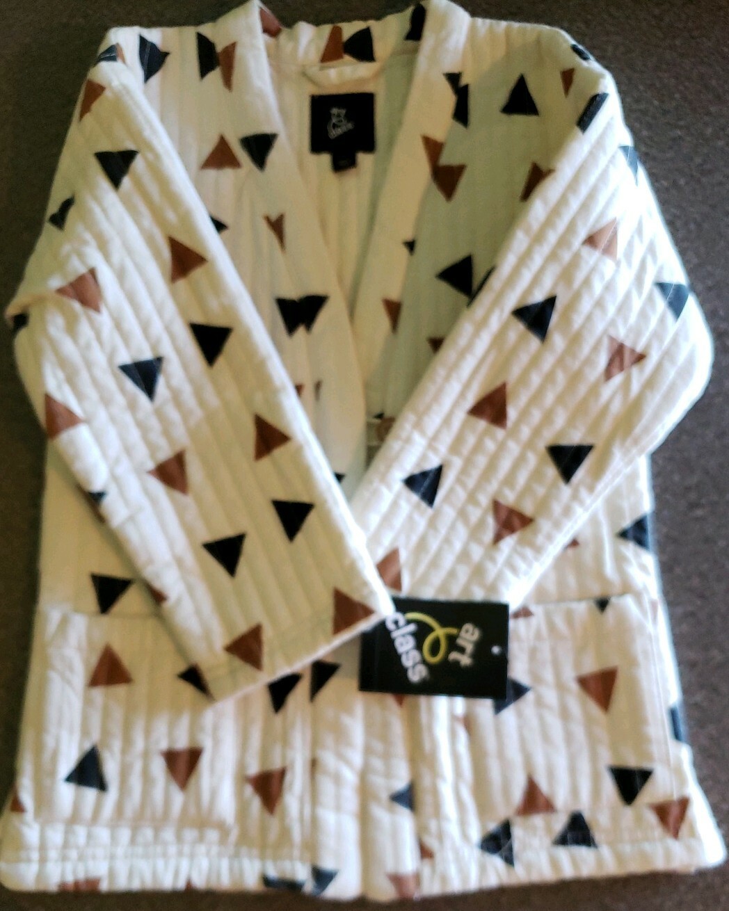 This sale is for one (1) art class? brand jacket Girls' Size 4T 39" - 43" tall 32.5 - 37 pounds Long sleeve jacket Face back ~ 100% Cotton Fill ~ 100% Polyester Kimono type quilted jacket Two (2) front hand pockets One (1) button closure Off-white background with brown black triangle design throughout Machine wash ~ Tumble dry Jacket is new with tags Please view photos for a good description of this item Thank you!