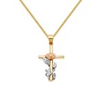 This stunning 14k tri-tone gold fancy floral cross pendant necklace combines elegance and faith. The design features a yellow gold cross accompanied by a rose gold rose flower and a white gold leafy vine, creating a beautiful representation of spirituality. The pendant hangs from a matching 14k yellow gold flat wheat chain, available in lengths of 16, 18, 20, 22, or 24 inches, allowing for customization based on personal preference.
