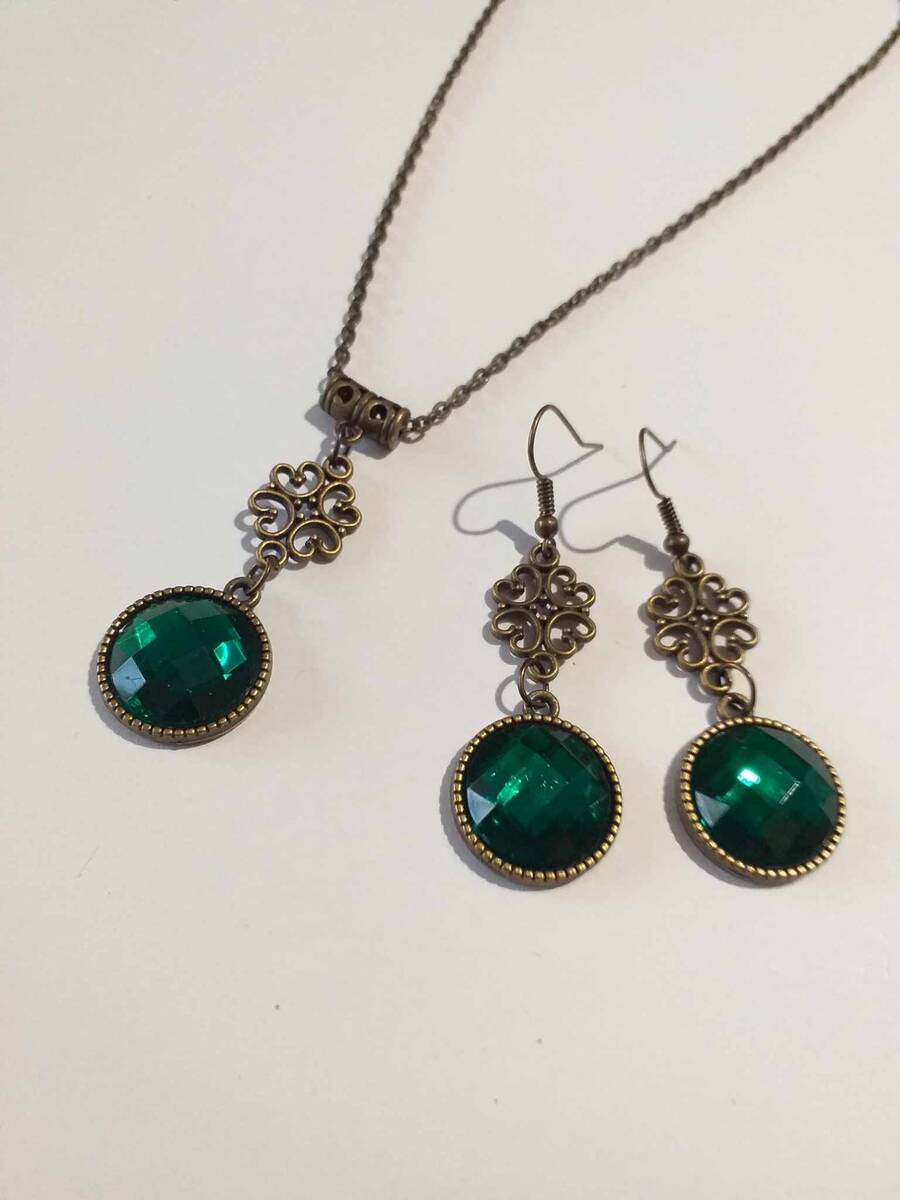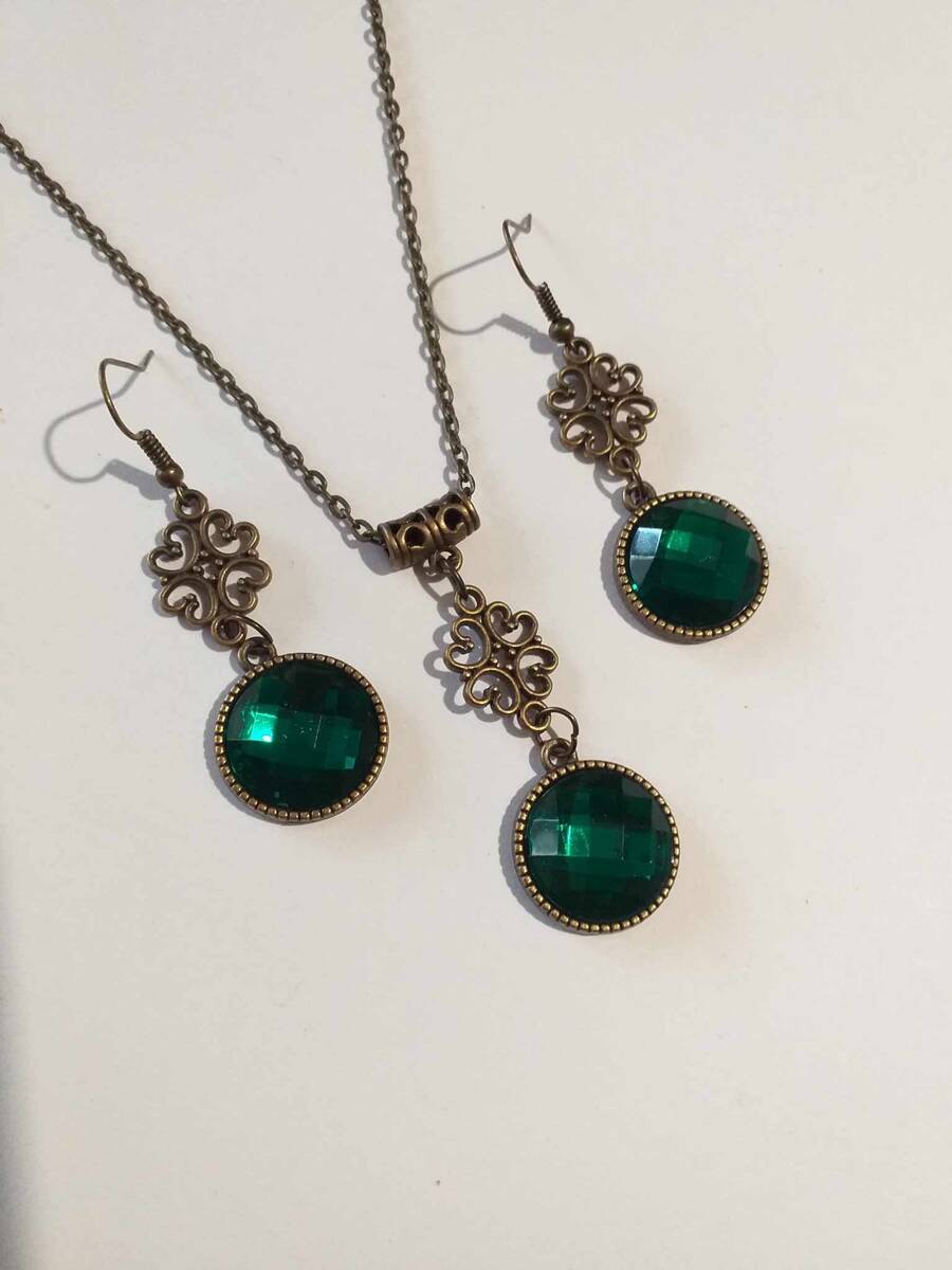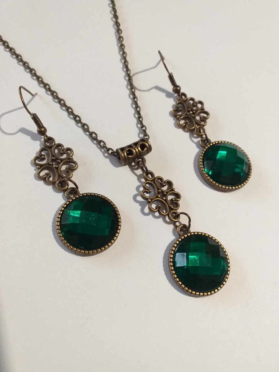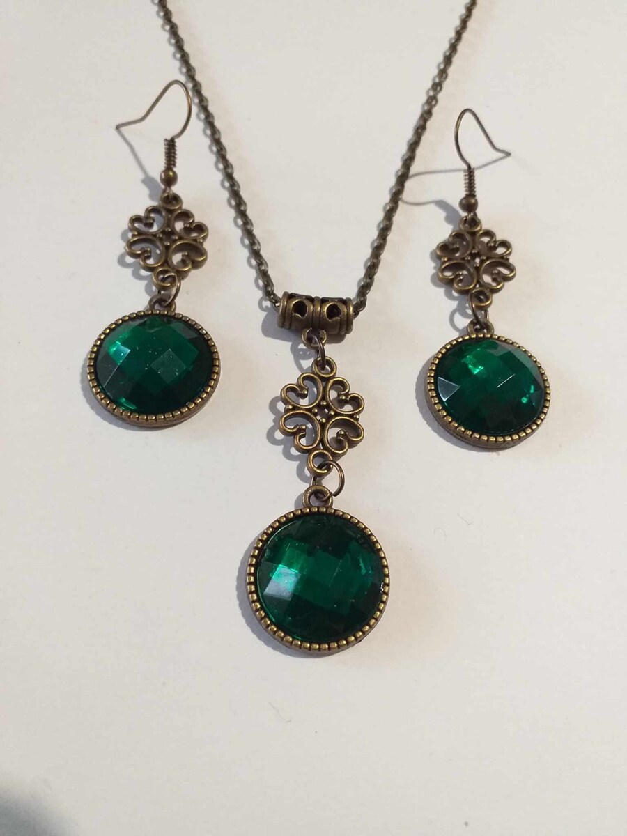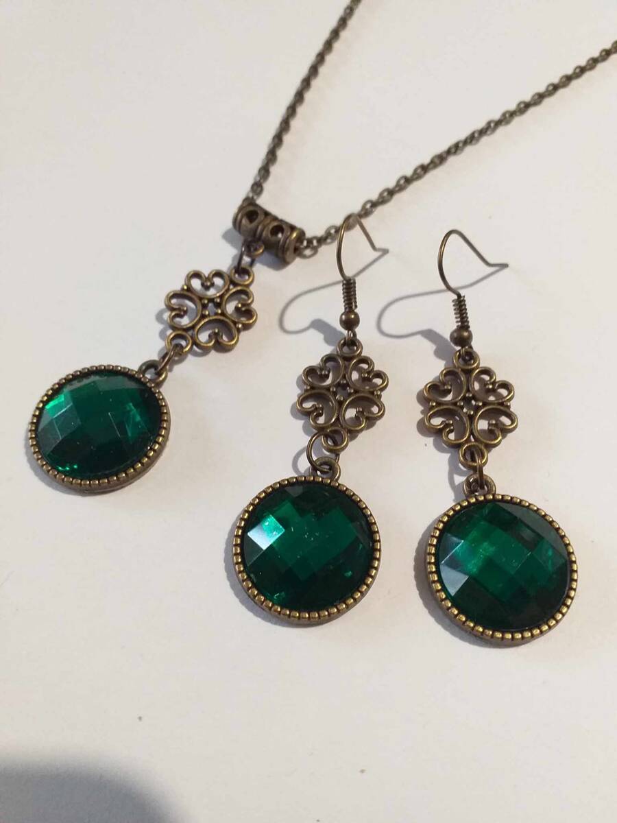 Beautiful Set of bronze-tone Antique style dark Emerald green necklace and earrings. Bronze tone Victorian style necklace and earrings. Boho necklace. Bohemian necklace and earrings. Romantic necklace and earrings. Beautiful necklace with same style earrings with dark Emerald green faux crystals acrylic cabochons.