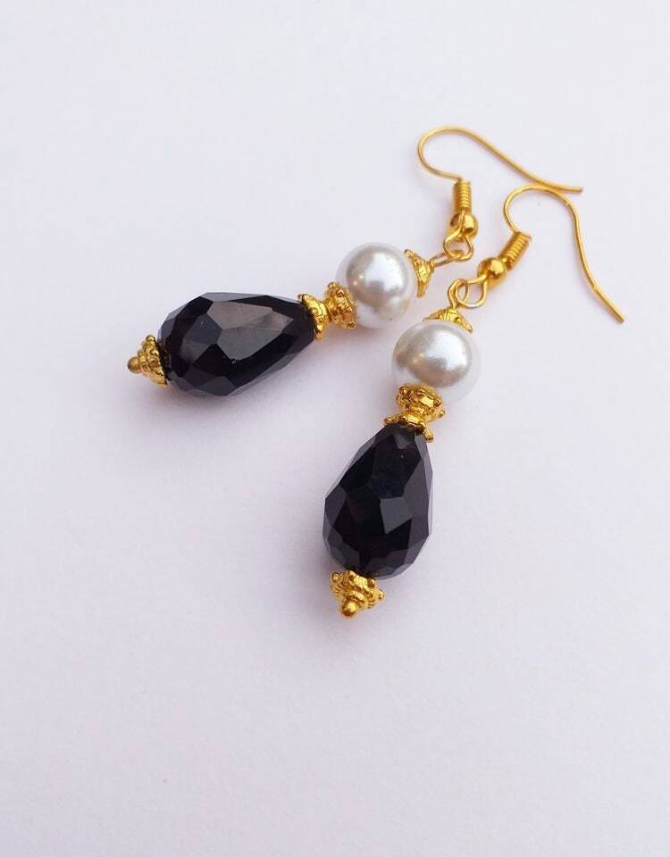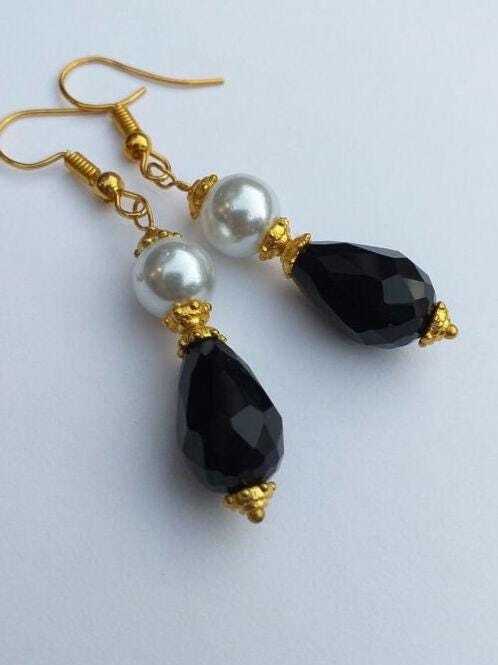 Material : gold tone ornaments beads, glass white pearls, black faceted crystals