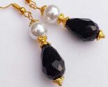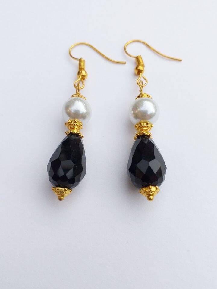 Beautiful Victorian filigree gold tone and glass white pearls earrings. Filigree earrings. Dangle earrings. Drop earrings . Boho earrings. Bohemian earrings. Gold - tone black faceted Czech black teardrop shaped crystals and white pearls earrings. Vintage style earrings. Baroque earrings. Antique style earrings. Bridal earrings. Wedding earrings. Royal style earrings .