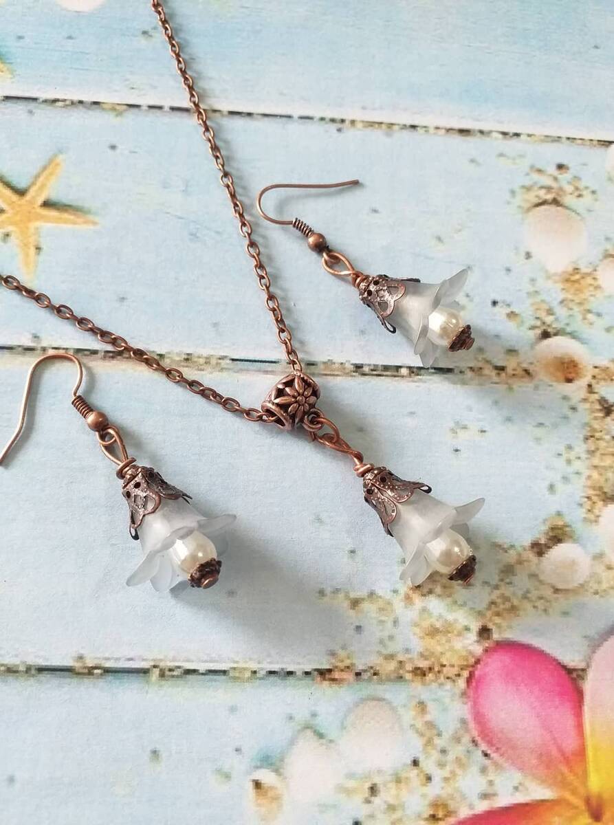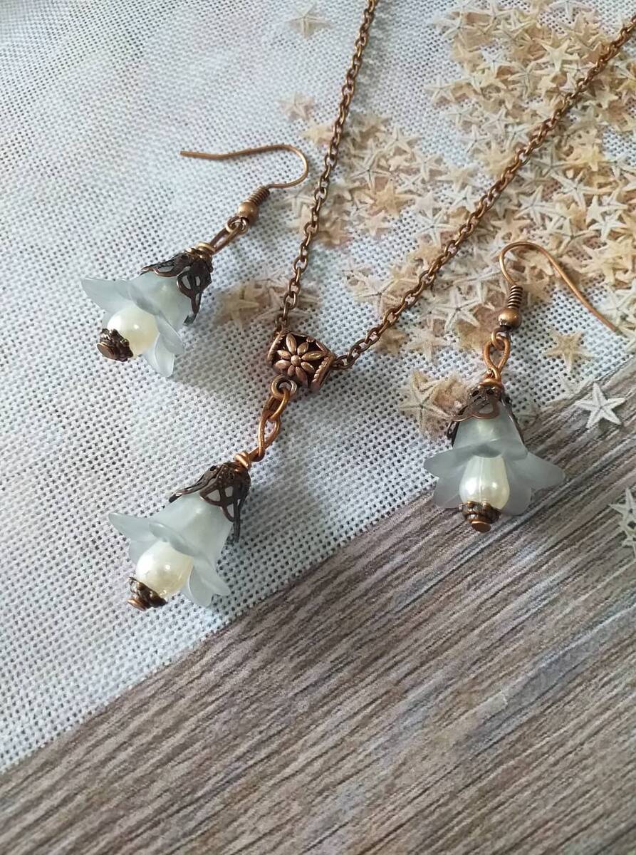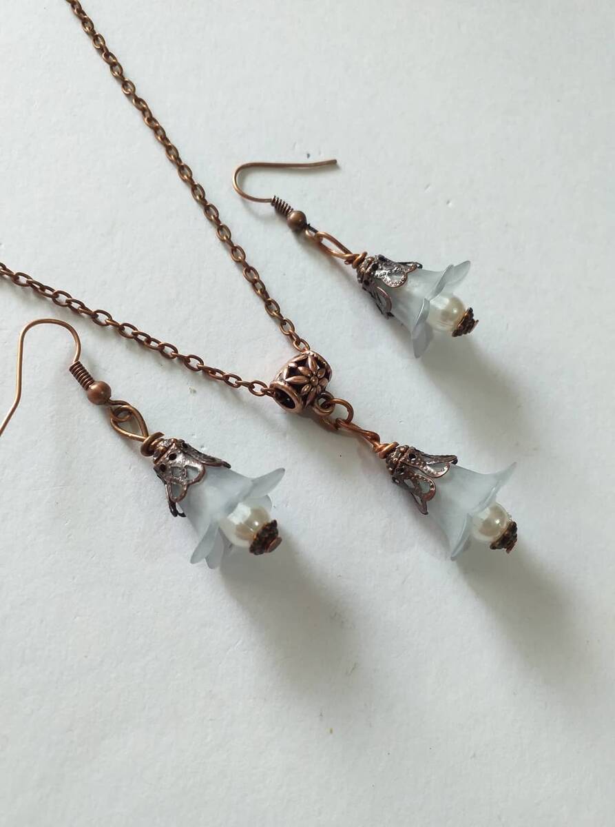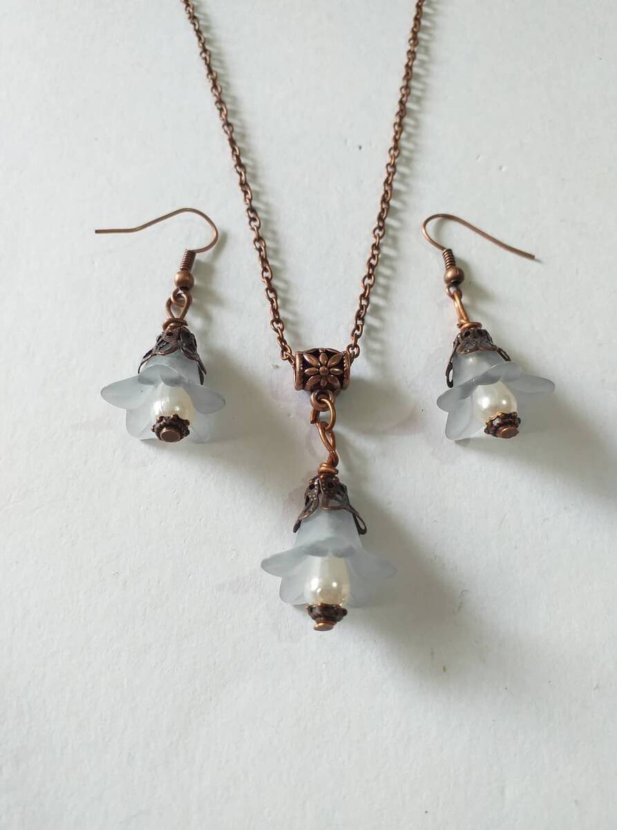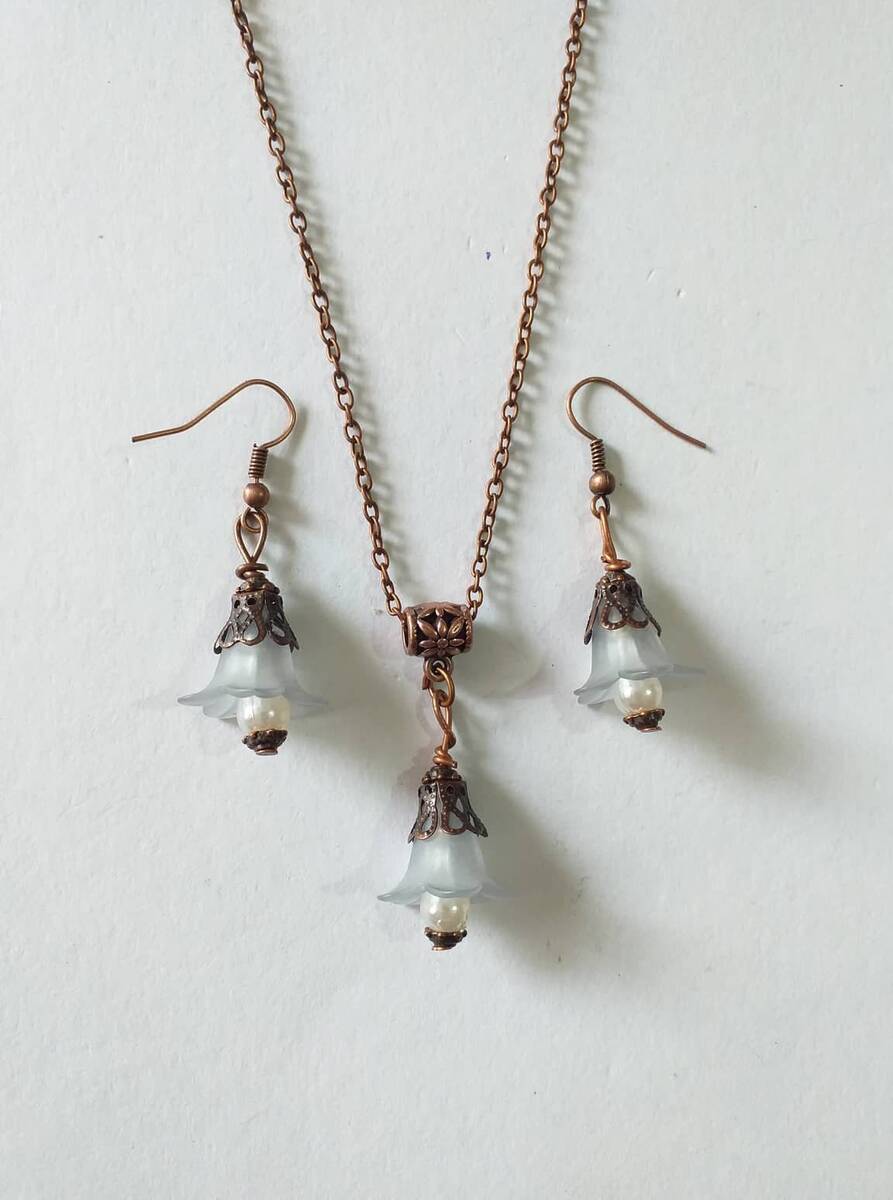 Beautiful Set of copper Antique style plastic beautiful blue-gray flower necklace and earrings . Copper and gray flowers and white plastic pearls beads Victorian style necklace and earrings . Boho necklace . Bohemian necklace and earrings . Romantic necklace and earrings . Beautiful necklace with same style earrings with beautiful gray flowers and copper ornaments .