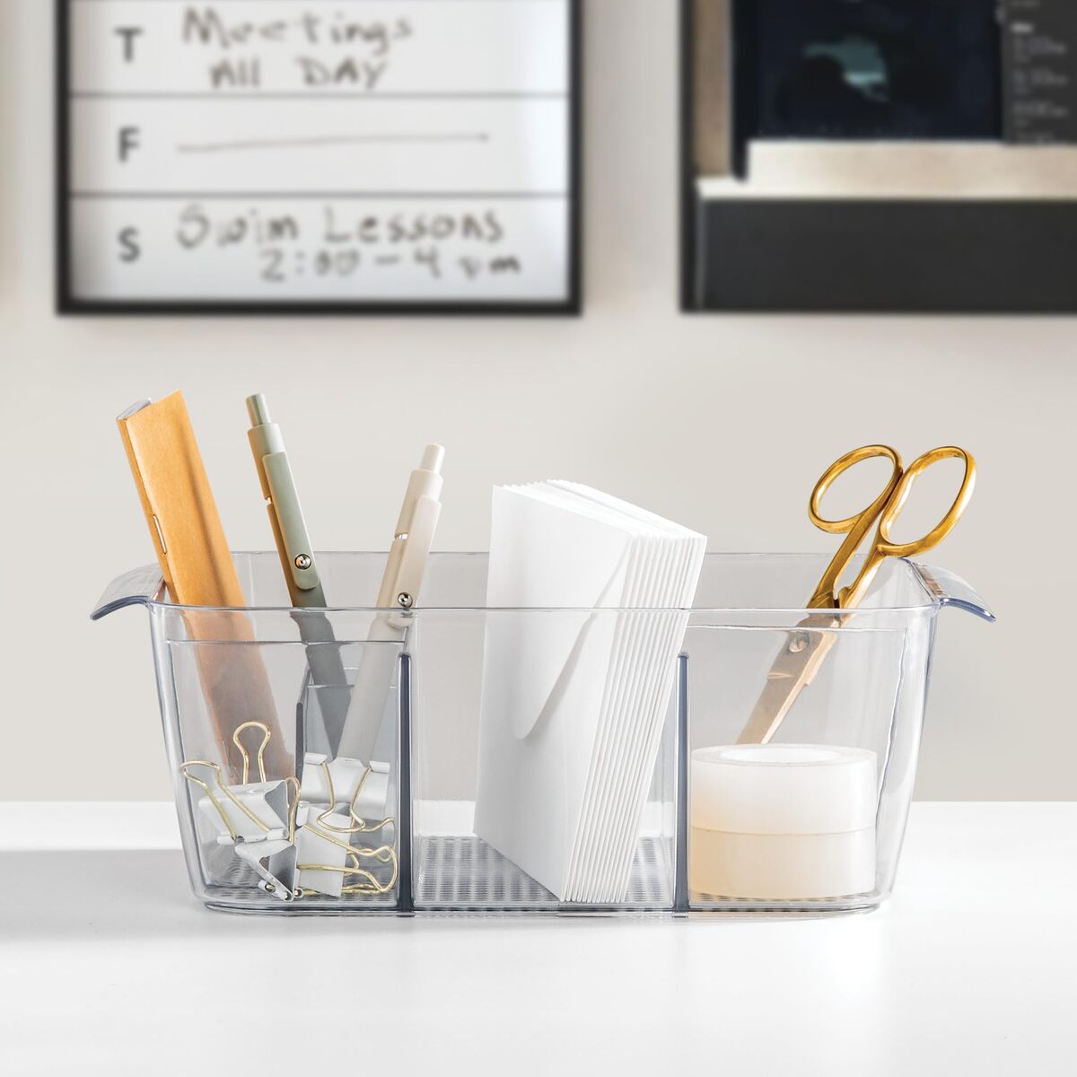 Bullet point: PLASTIC STORAGE CONTAINER: Vanity organizer perfect for storing makeup brushes, tweezers, cosmetics, medication, contact lenses, glasses, pens, pencils, scissors, earrings, rings, and more. Ideal for storing items on or under your counter, vanity, dresser, nightstand, or desk in your bathroom, bedroom, kitchen, office, college dorm, or craft room