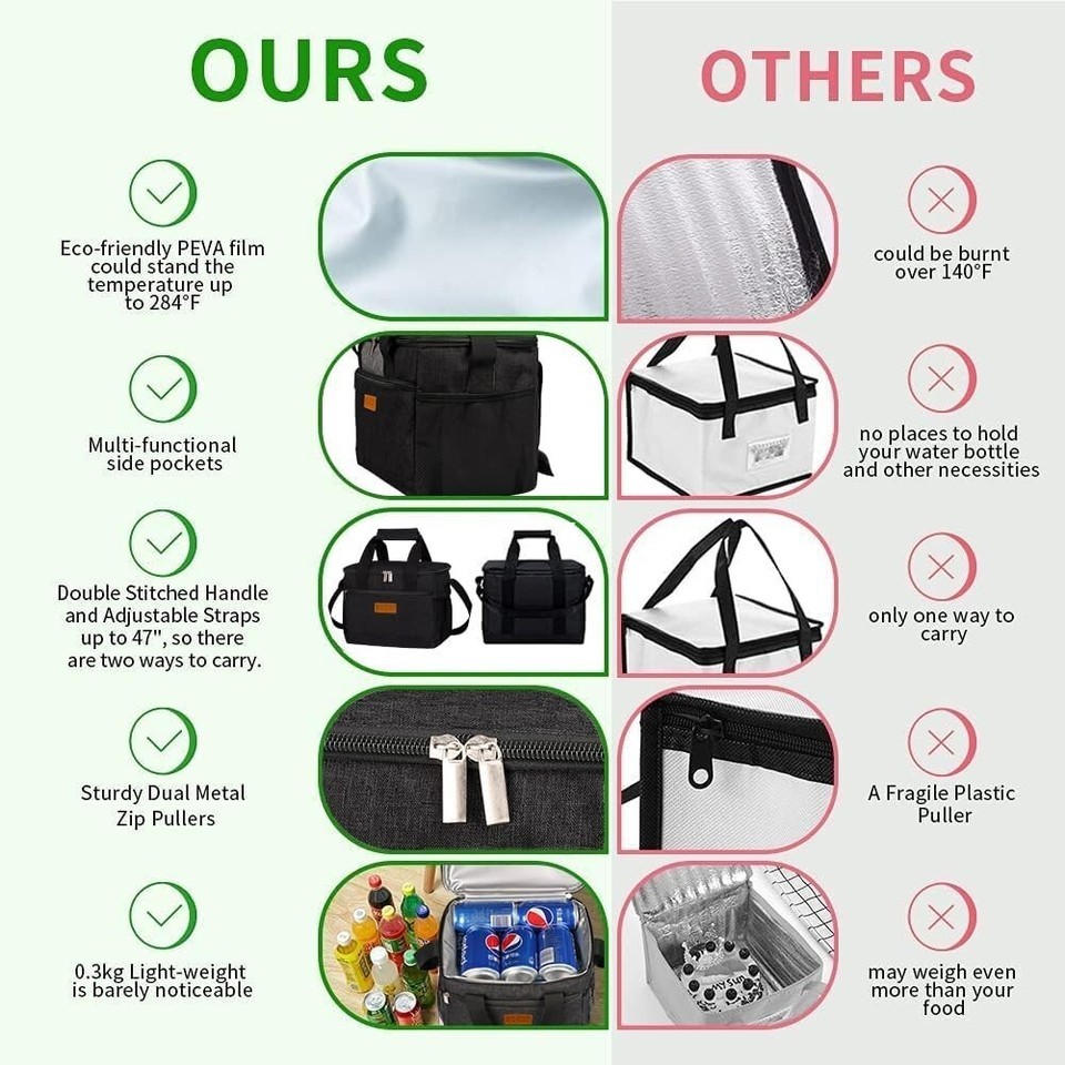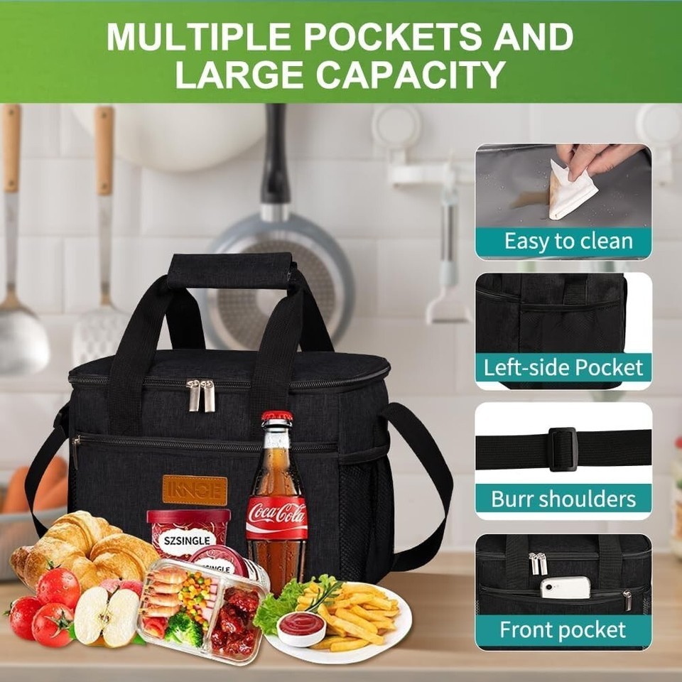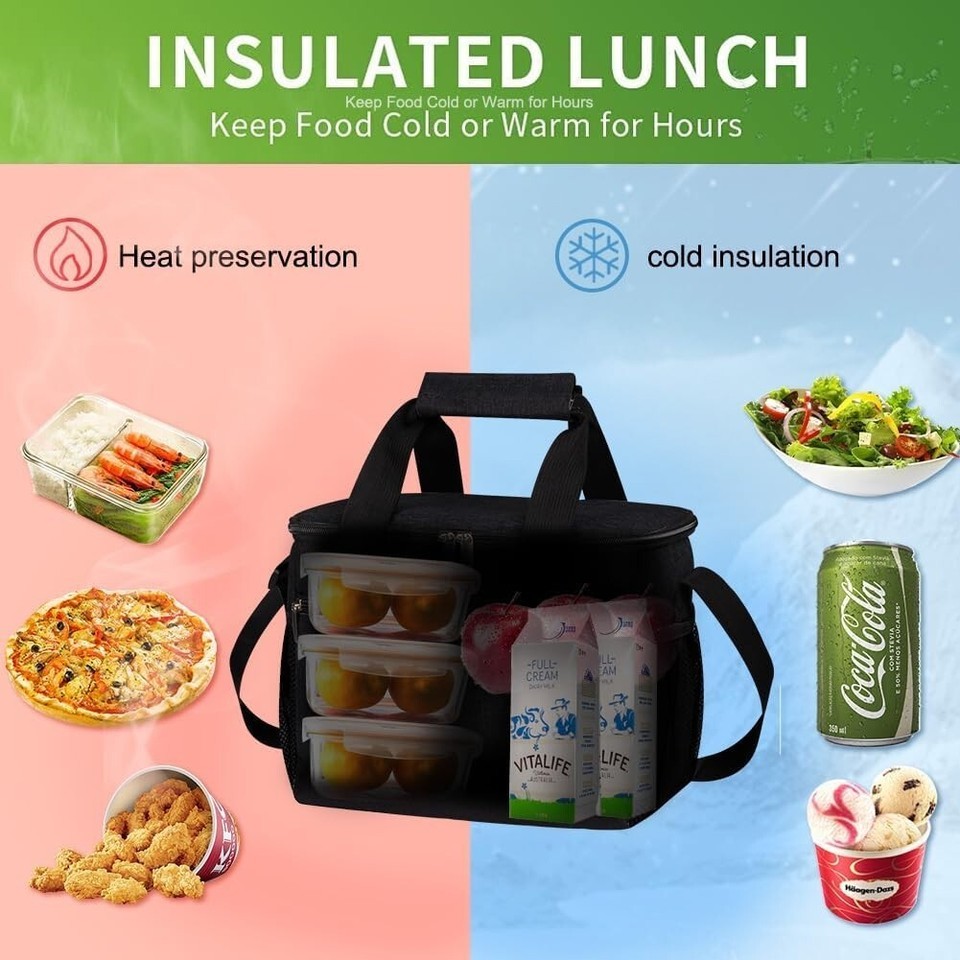 About this item ?INSULATED STURDY?: 5mm pearl foam padding and eco-friendly PEVA lining of lunch boxes keep food warm or cold for 8 hours. Double-stitched zippers and premium metal dual zip pullers of lunch coolers ensure smooth open, rip-resistant and maximum durability. ?LEAKPROOF WATERPROOF?: Eco-friendly PEVA soft liner food bag is easy to clean with just a wet cloth or napkin and against liquid penetration. The heat-welded seams prevent leaking. 600D durable Oxford surface is programmed for maximum tearing-resistant. ?LARGE CAPACITY MUTI-POCKETS?: 10x6.69x7.92"(LxWxH) As a meal prep lunch bag, the main compartment could hold 24 cans or your three meals in a day. 1 zipper pocket, 1 top inner mesh and 2 side mesh pockets could fit your keys, cards, phone chargers, napkins, water bottles, utensils, etc. ?PORTABLE LIGHT-WEIGHT?: Ikone insulated lunch bag is featured with a handle on top and an adjustable and detachable shoulder strap, so you carry it with your hands or pull it over to your shoulders. The wide opening design makes lunch bags convenient to fill and take food. The lightweight (0.3kg) feature entitles it as lunch bags for women, men. You use this as a lunch bag, cooler bag, picnic bag, shopping bag, etc. ?MUTIPLE OCCASIONS Gift?: The women's and men's lunchbox for work could keep you enjoy healthy food anywhere you go, hiking, shopping, traveling, camping, working, fishing, picnics, beach, etc. It is also a perfect gift for your families and friends.
