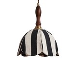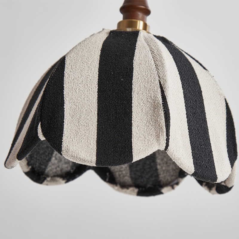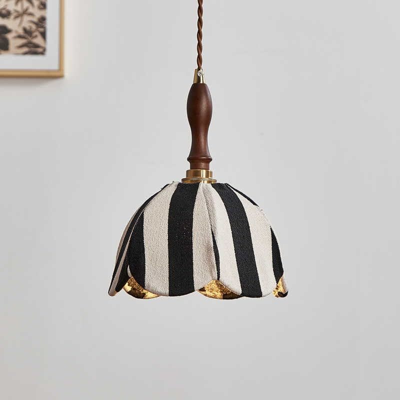 Product description: Transform your space with this Designer Retro Pendant Lamp by Interoknack. The striking black and cream velvet stripe shade paired with a hand-turned wooden top creates a sophisticated focal point that captures the essence of Parisian and Southeast Asian boutique lighting. Measuring 7.9" in diameter and 11" in height, this compact chandelier is perfectly sized for bedside illumination, coffee bars, intimate lounge corners, or upscale restaurants. The luxurious velvet fabric diffuses light beautifully, creating a warm, inviting ambiance while showcasing its distinctive texture and pattern. Built with quality craftsmanship, this pendant lamp includes a secure suspension cord for worry-free installation. Compatible with standard E27 bulbs (not included), you can customize the lighting effect with LED or vintage Edison bulbs to match your desired atmosphere. Whether adorning a bedroom, bar, designer studio, or rental property, this original pendant lamp serves as both practical lighting and an artful design statement.
