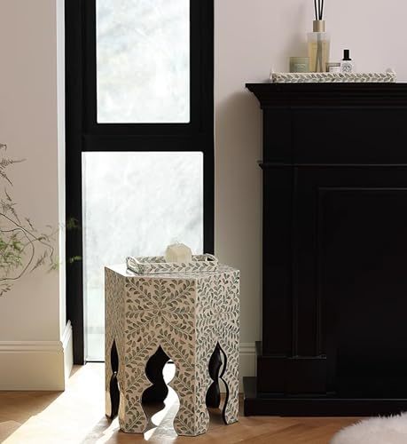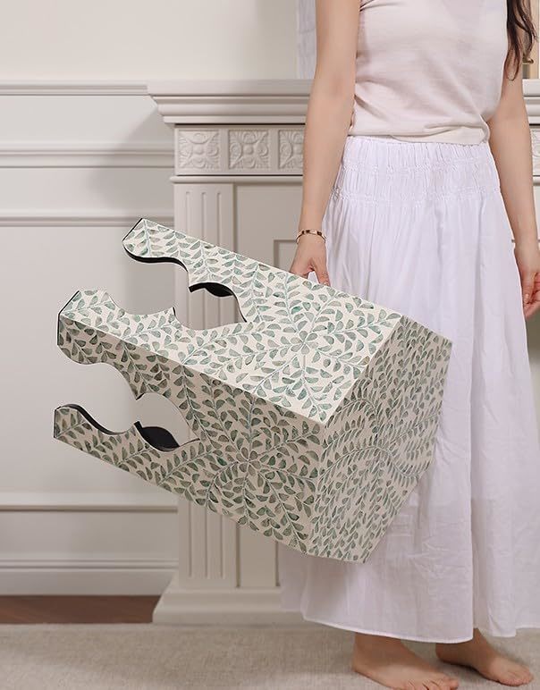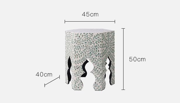 Product description: Elevate your living space with this exquisite Vietnamese garden stool, where traditional artistry meets modern functionality. The stunning piece showcases intricate green floral motifs meticulously hand-inlaid against a cream-colored backdrop, creating a sophisticated pattern that captures the essence of Vietnamese decorative arts. Standing at 19.7 inches tall with dimensions of 17.7 inches wide by 15.7 inches deep, this versatile bone inlay stool features a classic hourglass silhouette with decorative cutout details that add visual lightness while maintaining impressive structural strength. Perfect as a side table, plant stand, or extra seating, it seamlessly adapts to various settings from contemporary living rooms to covered patios. Each piece is uniquely handcrafted by skilled artisans, ensuring no two are exactly alike. The durable construction supports substantial weight, while the sealed surface ensures lasting beauty. This garden stool bridges cultural heritage with contemporary style, bringing a touch of Southeast Asian elegance to any room.