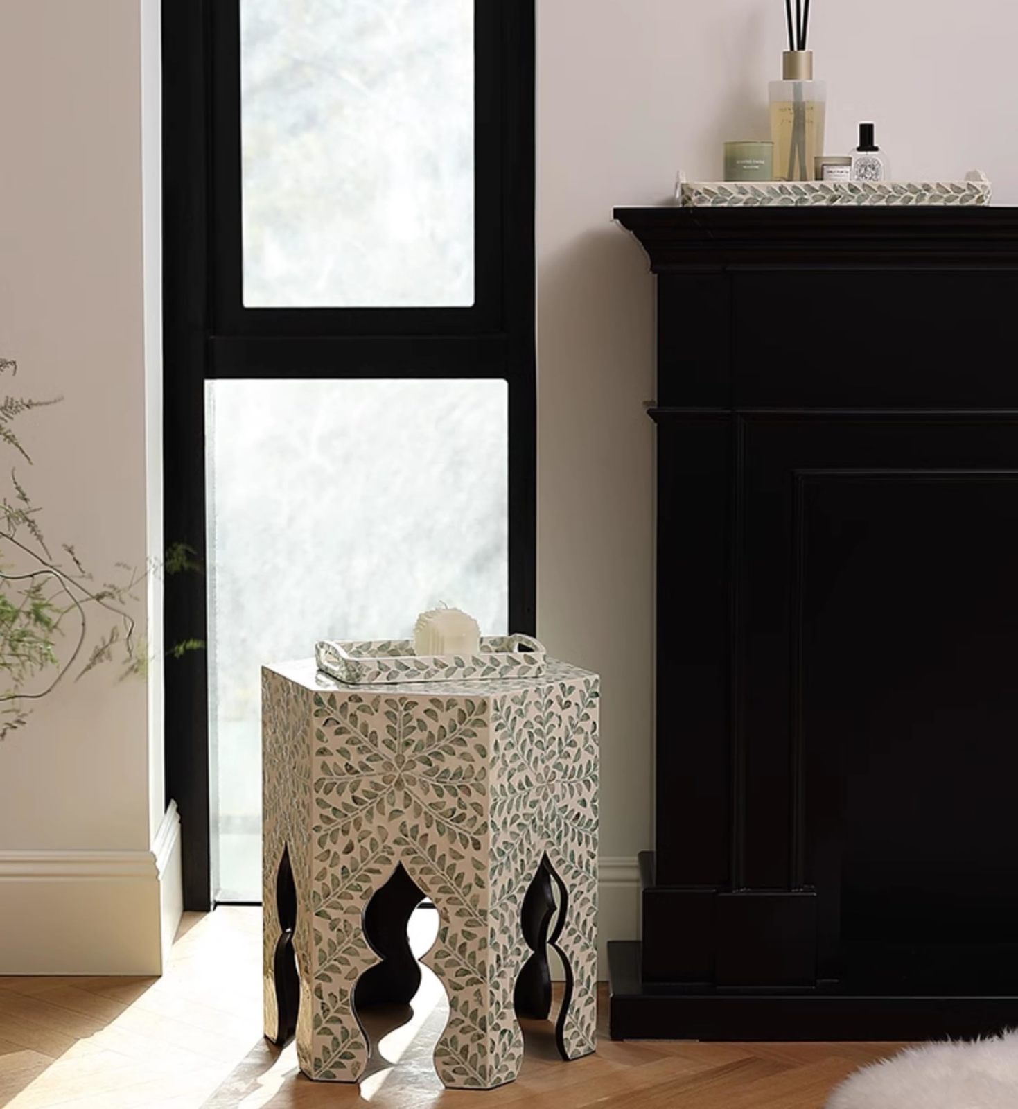 interoknack Garden Stool with Green Bone Inlay, Carved Floral Pattern Side Table