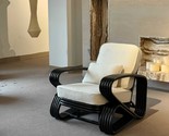 Product description: Elevate your living space with this exquisite vintage-inspired lounge chair that masterfully combines solid wood and handwoven natural rattan. The plush upholstered cushion and supportive back pillow create an inviting retreat perfect for relaxation or conversation. With its gracefully curved frame and retro-modern silhouette, this accent armchair embodies authentic Japandi style, bringing together wabi-sabi aesthetics and vintage charm to complement contemporary, bohemian, or eclectic interiors. Each chair is meticulously handcrafted by skilled artisans, ensuring unique character and exceptional quality. The generous dimensions (35.4" W x 38.6" D x 33.9" H) provide spacious comfort while maintaining versatility for any room arrangement. Whether positioned in your living room, study, or bedroom, this statement piece promises to be the focal point of your space while offering lasting durability and sophisticated style that transcends passing trends.