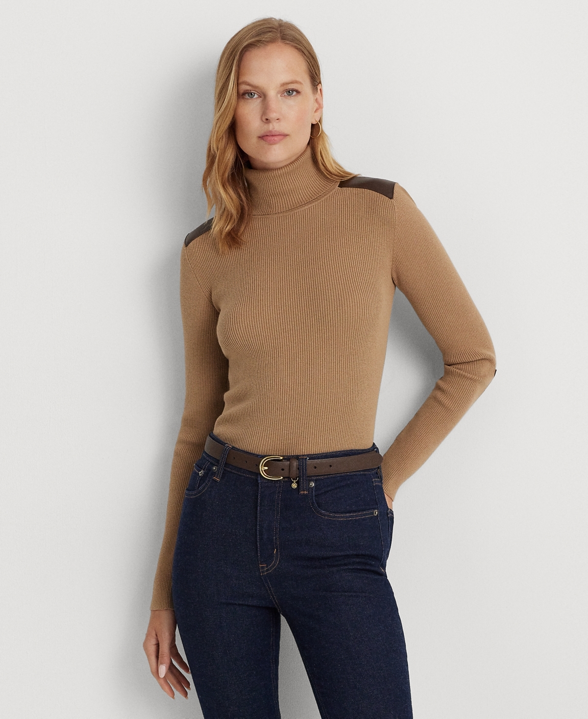 LAUREN Ralph Lauren Faux Leather-Trim Ribbed Turtleneck (Classic Camel) Women's Sweater / MED BEIGE / M