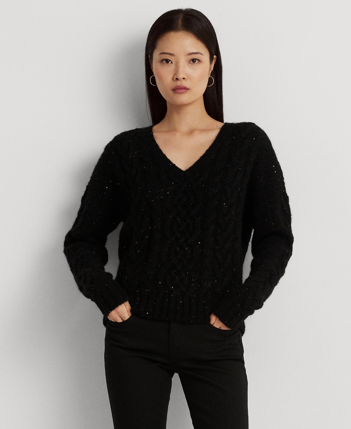 Lauren Ralph Lauren Women's Sequined Wool-Blend Aran-Knit Sweater - Black / BLACK / M