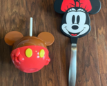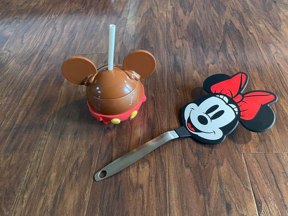 Set of 2 Disney World SOUVENIRS- Mickey Mouse Candy Apple Bottle Tumbler Minnie Mouse Spatula Food Turner 100% Original (From Disney World Orlando) Item details: This drinking tumbler looks good enough to eat. Based on the totally yummy Mickey Mouse caramel apple treats found at the Disney Parks, it includes a detachable base inspired by Mickey's signature shorts. It's sure to whet your appetite for your next trip to the parks and quench your thirst at the same time. Molded Mickey caramel apple tumbler with straw Detachable red Mickey shorts base Screw-top lid Flush fill Reusable white straw with flange on bottom so it won't fall out Part of the Disney Parks Food Collection Bring magic to the kitchen with our Minnie Mouse flexible spatula. Crafted of heat-resistant nylon with a stainless-steel handle, it excels at flipping pancakes, eggs and fresh-baked cookies. Plus, the iconic shape makes cooking fun for Mouseketeers of all ages. Flexible nylon head won't scratch nonstick pans. Heat-resistant to 400F. Ergonomic polished stainless-steel handle provides superior control. Dishwasher safe.