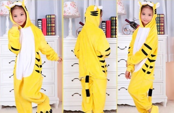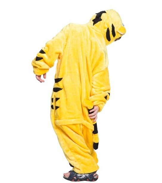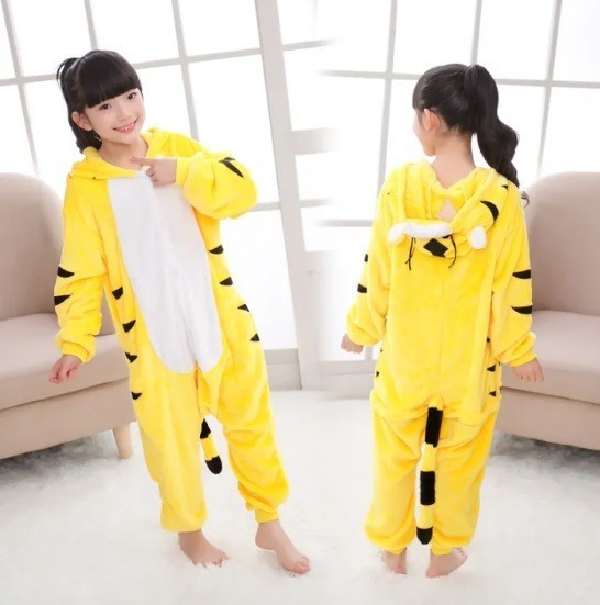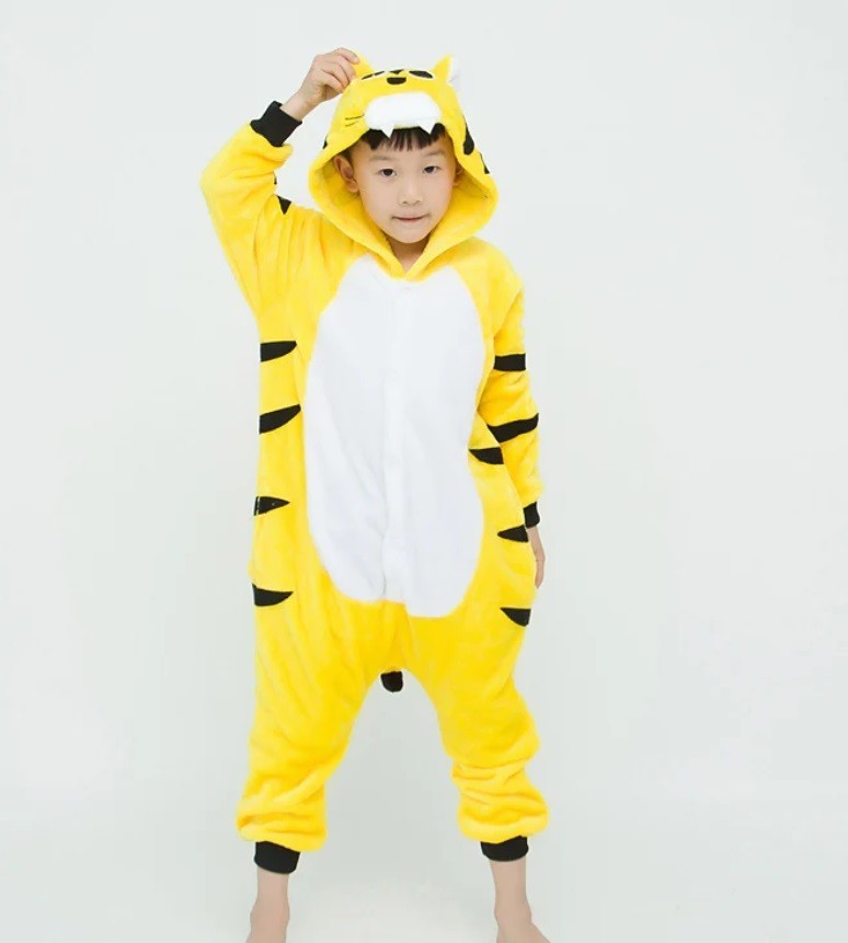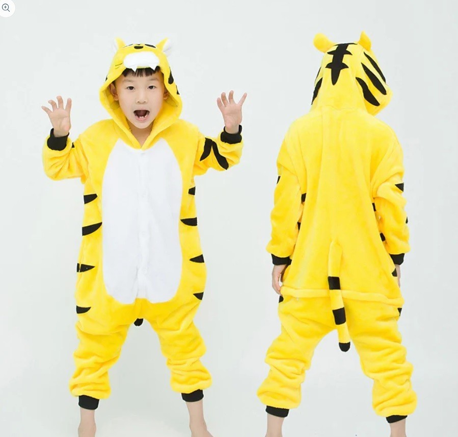 new Kids' TIGER Costume Pajama Jumpsuit Yellow/black color jumpsuit with tiger hood and tail on back. Button closure on front. Zip opening on back bottom for easy going to the bathroom :) Size on tag is 140cm (European sizing) will equal M- medium (8-10years US sizing) Baggy/oversized/loose fit.